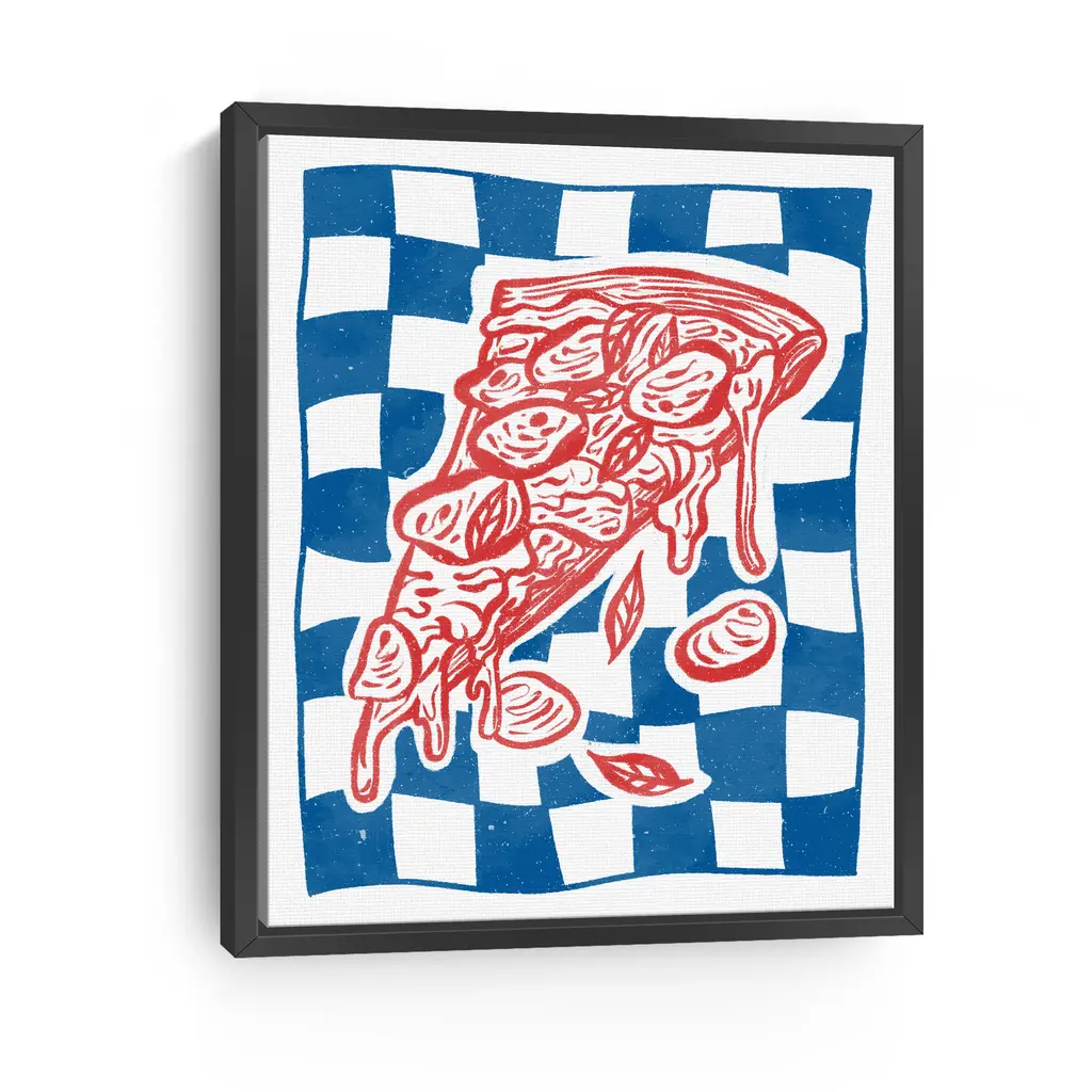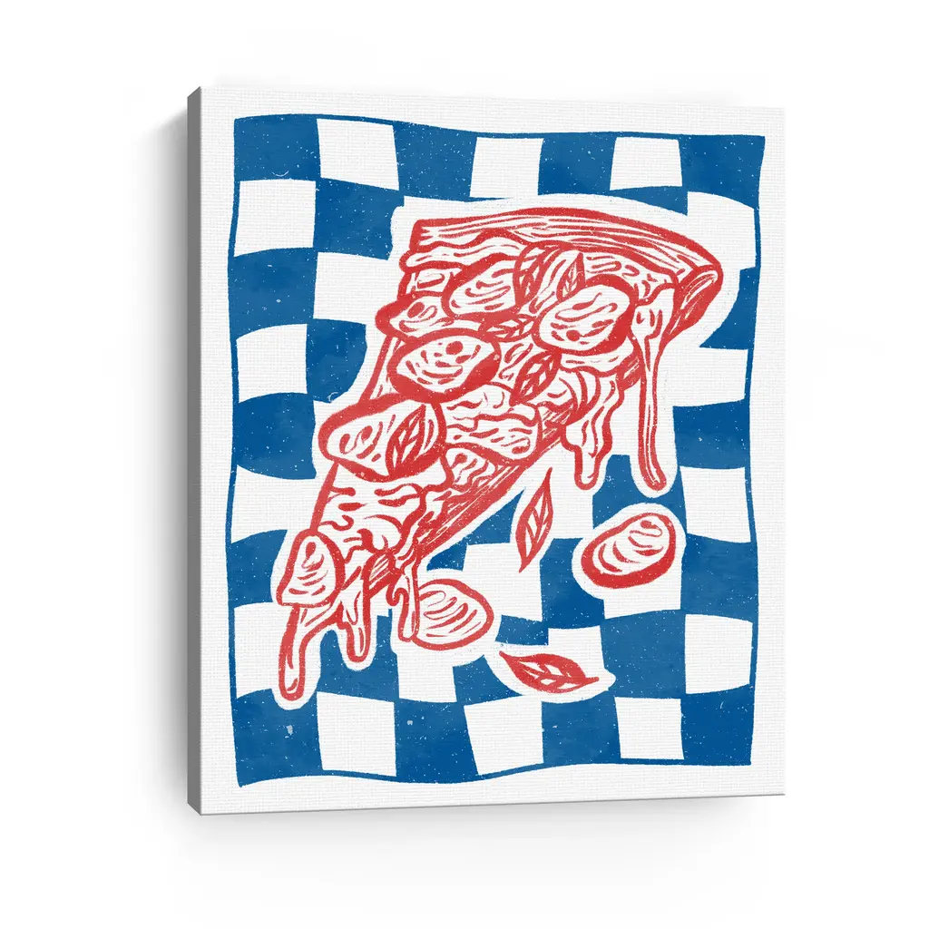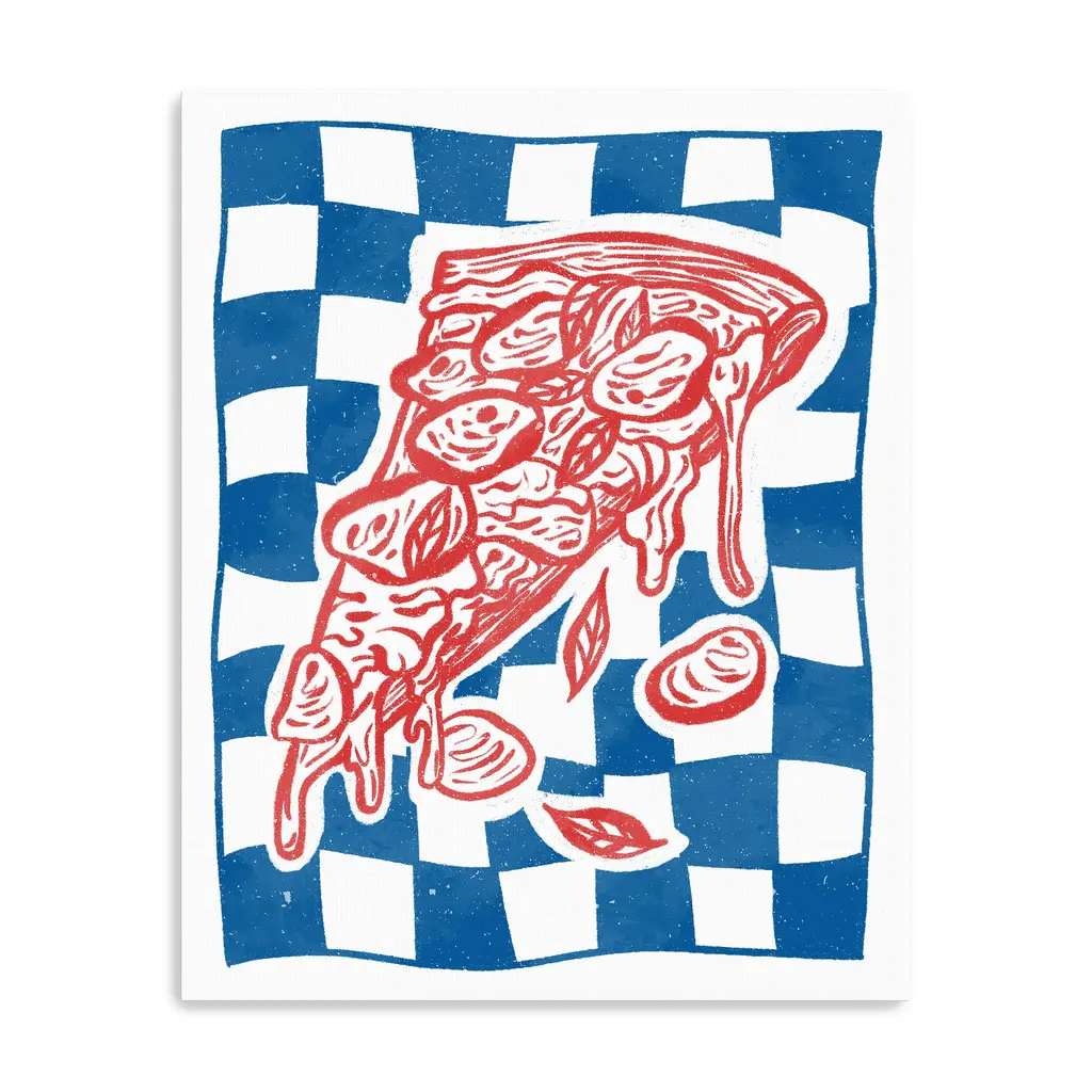 This eye-catching canvas art captures the joy of comfort food with a stylized pepperoni slice in vivid red, set against a classic blue-and-white checkered pattern. Ideal for foodies and fun-loving interiors, it brings instant warmth and personality to your wall. Our Gallery Wrap Canvas Prints are proudly assembled with high quality materials in California, USA. Each piece is printed on a thick, archival grade canvas using Giclee technology. It is then hand-stretched by our experienced artisans over solid wood bars, which will not warp over time. The final product is a piece personally crafted for you to confidently display on your wall. Care and Assembly: Ensure that the location of your piece has little to no exposure to heat, sunlight, and moisture. Wipe clean, only if needed. Each piece includes hanging hardware to hang on your wall vertically.