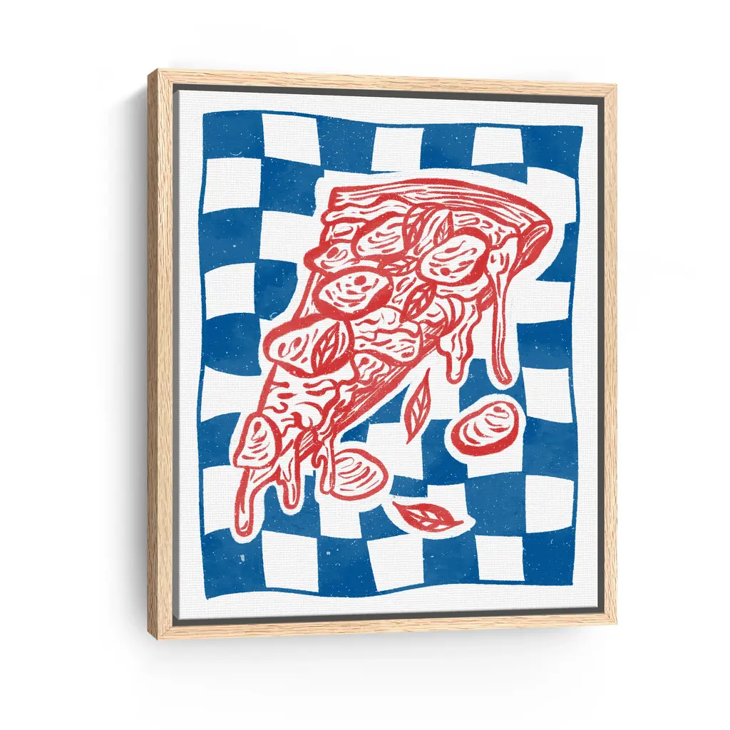 This eye-catching canvas art captures the joy of comfort food with a stylized pepperoni slice in vivid red, set against a classic blue-and-white checkered pattern. Ideal for foodies and fun-loving interiors, it brings instant warmth and personality to your wall. Our Gallery Wrap Canvas Prints are proudly assembled with high quality materials in California, USA. Each piece is printed on a thick, archival grade canvas using Giclee technology. It is then hand-stretched by our experienced artisans over solid wood bars, which will not warp over time. The final product is a piece personally crafted for you to confidently display on your wall. Care and Assembly: Ensure that the location of your piece has little to no exposure to heat, sunlight, and moisture. Wipe clean, only if needed. Each piece includes hanging hardware to hang on your wall vertically.
