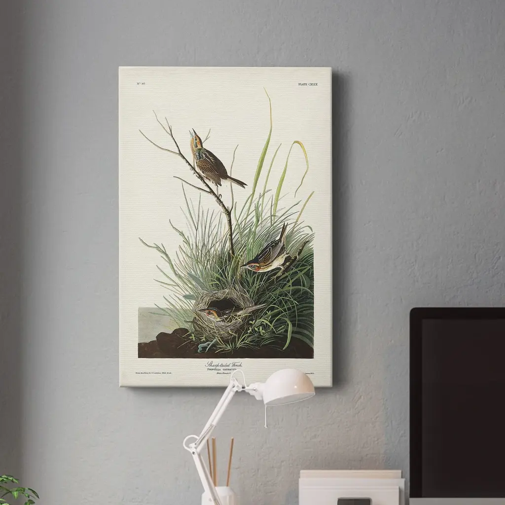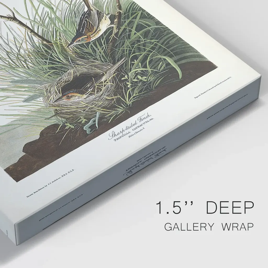 Pl. 149 Sharp-tailed Finch Premium Gallery Wrapped Canvas - Ready to Hang A premium hand stretched gallery wrapped canvas print created to last. Featuring a beveled a solid wood stretcher bar, each piece comes ready to hand 5 SIZES AVAILABLE 8''X12'' - Overall Size 16'X20'' - Overall Size 24''x32'' - Overall Size 30''x40'' - Overall Size 36''x48'' - Overall Size Each piece is made to order. Built to Last Each piece comes ready to hang Solid wood stretcher Fade and Water resistant Made domestically