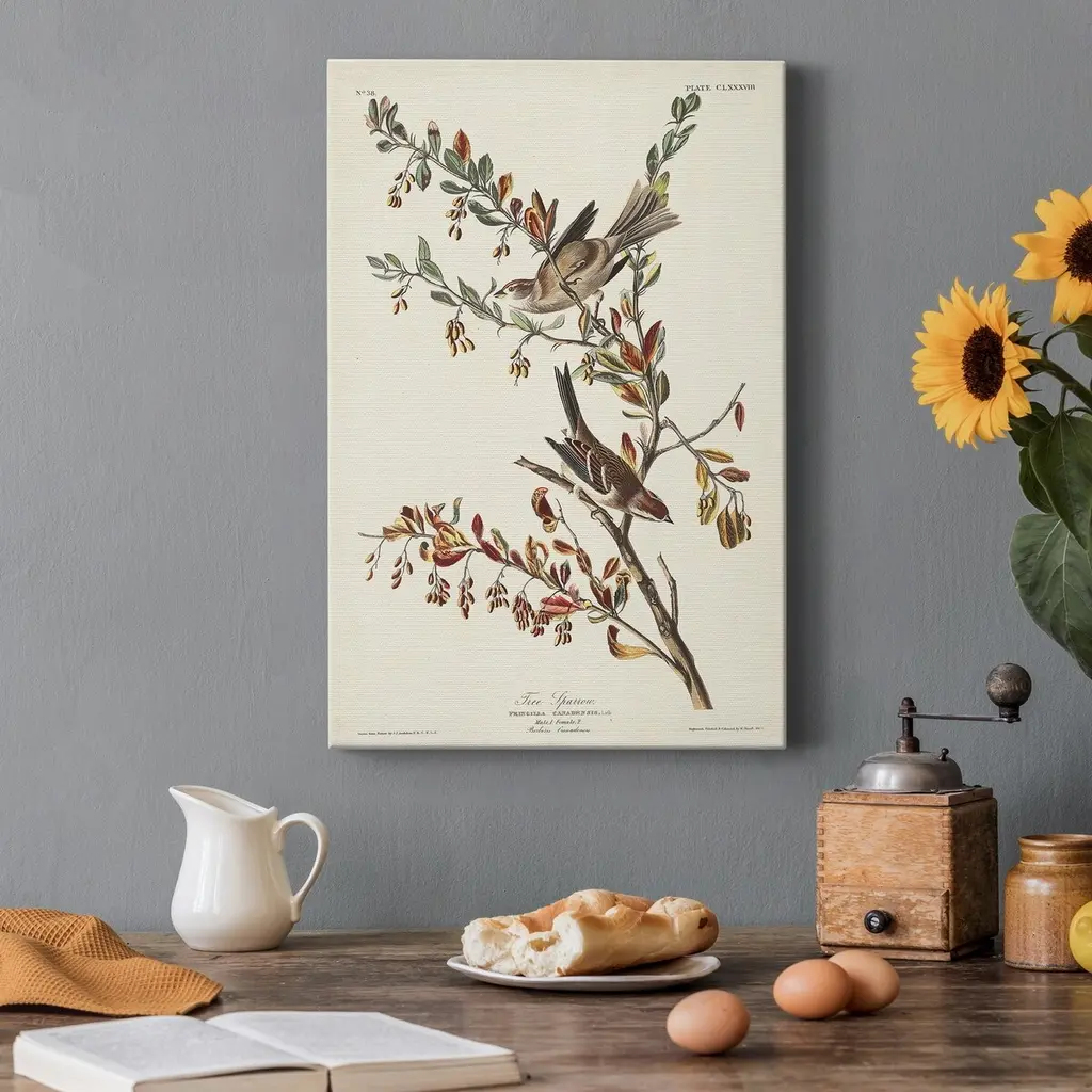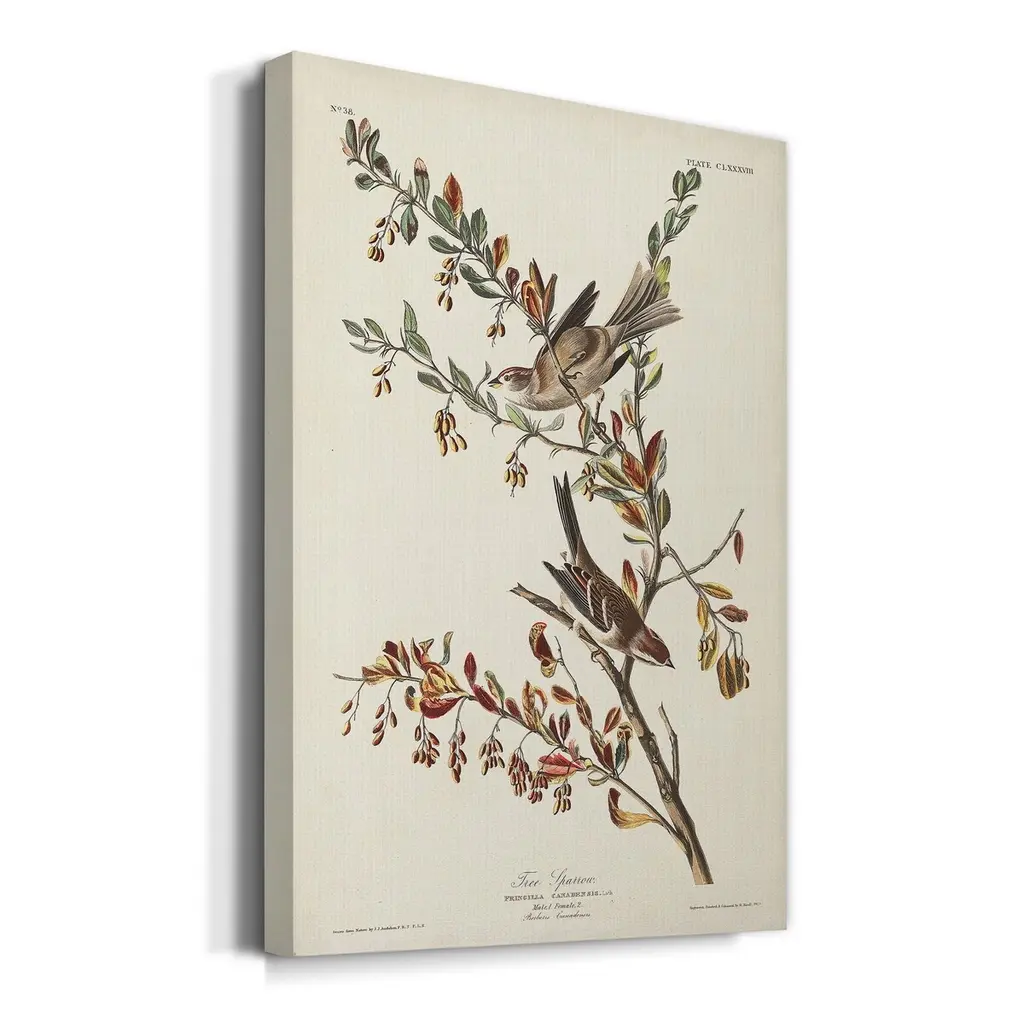 Pl. 188 Tree Sparrow Premium Gallery Wrapped Canvas - Ready to Hang A premium hand stretched gallery wrapped canvas print created to last. Featuring a beveled a solid wood stretcher bar, each piece comes ready to hand 5 SIZES AVAILABLE 8''X12'' - Overall Size 16'X20'' - Overall Size 24''x32'' - Overall Size 30''x40'' - Overall Size 36''x48'' - Overall Size Each piece is made to order. Built to Last Each piece comes ready to hang Solid wood stretcher Fade and Water resistant Made domestically