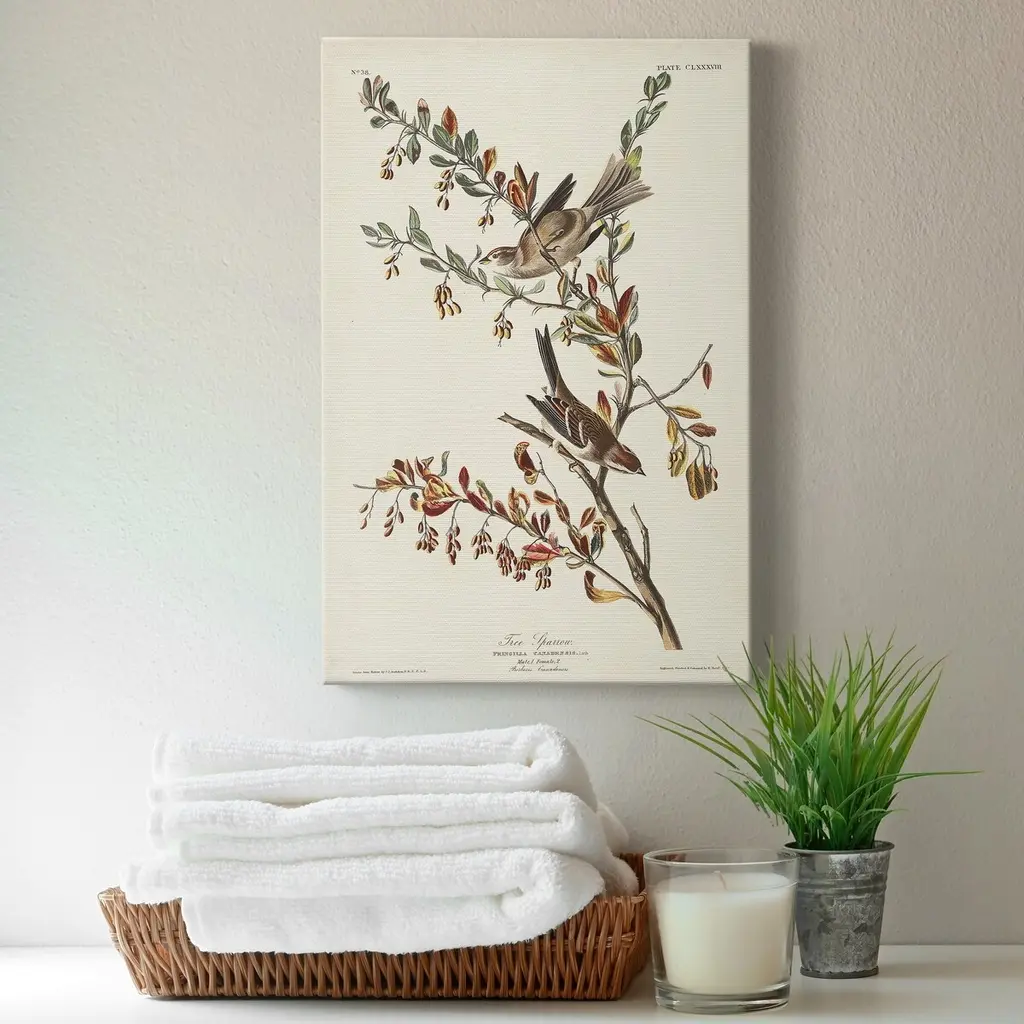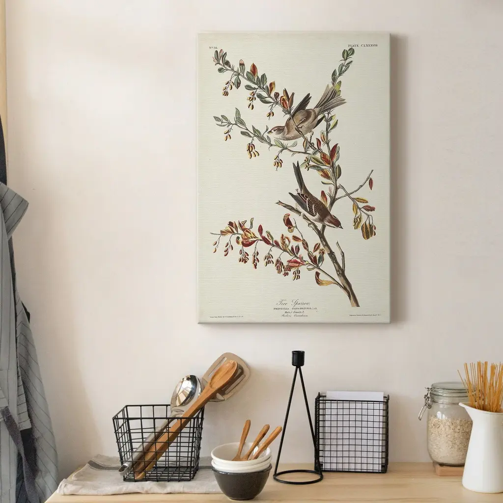 Pl. 188 Tree Sparrow Premium Gallery Wrapped Canvas - Ready to Hang A premium hand stretched gallery wrapped canvas print created to last. Featuring a beveled a solid wood stretcher bar, each piece comes ready to hand 5 SIZES AVAILABLE 8''X12'' - Overall Size 16'X20'' - Overall Size 24''x32'' - Overall Size 30''x40'' - Overall Size 36''x48'' - Overall Size Each piece is made to order. Built to Last Each piece comes ready to hang Solid wood stretcher Fade and Water resistant Made domestically