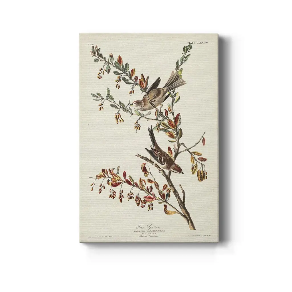 Pl. 188 Tree Sparrow Premium Gallery Wrapped Canvas - Ready to Hang A premium hand stretched gallery wrapped canvas print created to last. Featuring a beveled a solid wood stretcher bar, each piece comes ready to hand 5 SIZES AVAILABLE 8''X12'' - Overall Size 16'X20'' - Overall Size 24''x32'' - Overall Size 30''x40'' - Overall Size 36''x48'' - Overall Size Each piece is made to order. Built to Last Each piece comes ready to hang Solid wood stretcher Fade and Water resistant Made domestically