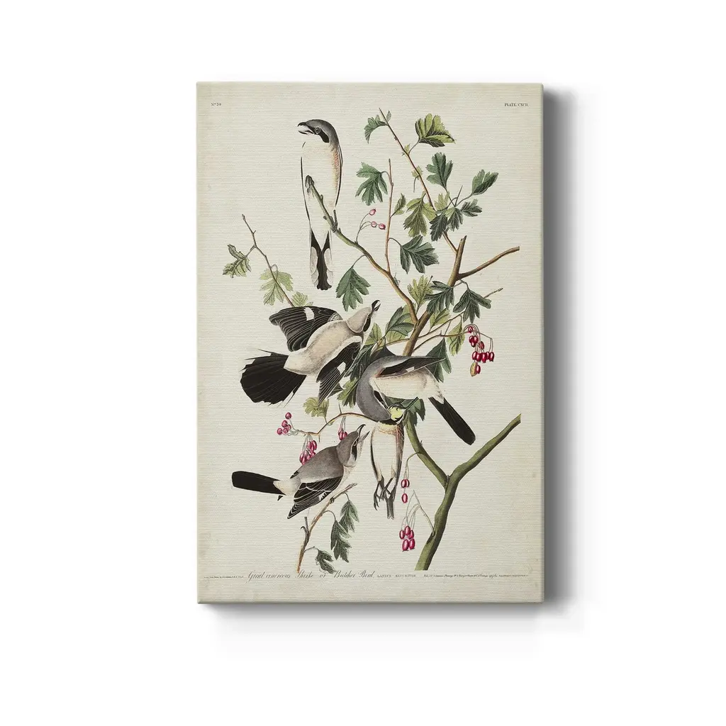 Pl 192 Great Cinereous Shrike Premium Gallery Wrapped Canvas - Ready to Hang A premium hand stretched gallery wrapped canvas print created to last. Featuring a beveled a solid wood stretcher bar, each piece comes ready to hand 5 SIZES AVAILABLE 8''X12'' - Overall Size 16'X20'' - Overall Size 24''x32'' - Overall Size 30''x40'' - Overall Size 36''x48'' - Overall Size Each piece is made to order. Built to Last Each piece comes ready to hang Solid wood stretcher Fade and Water resistant Made domestically
