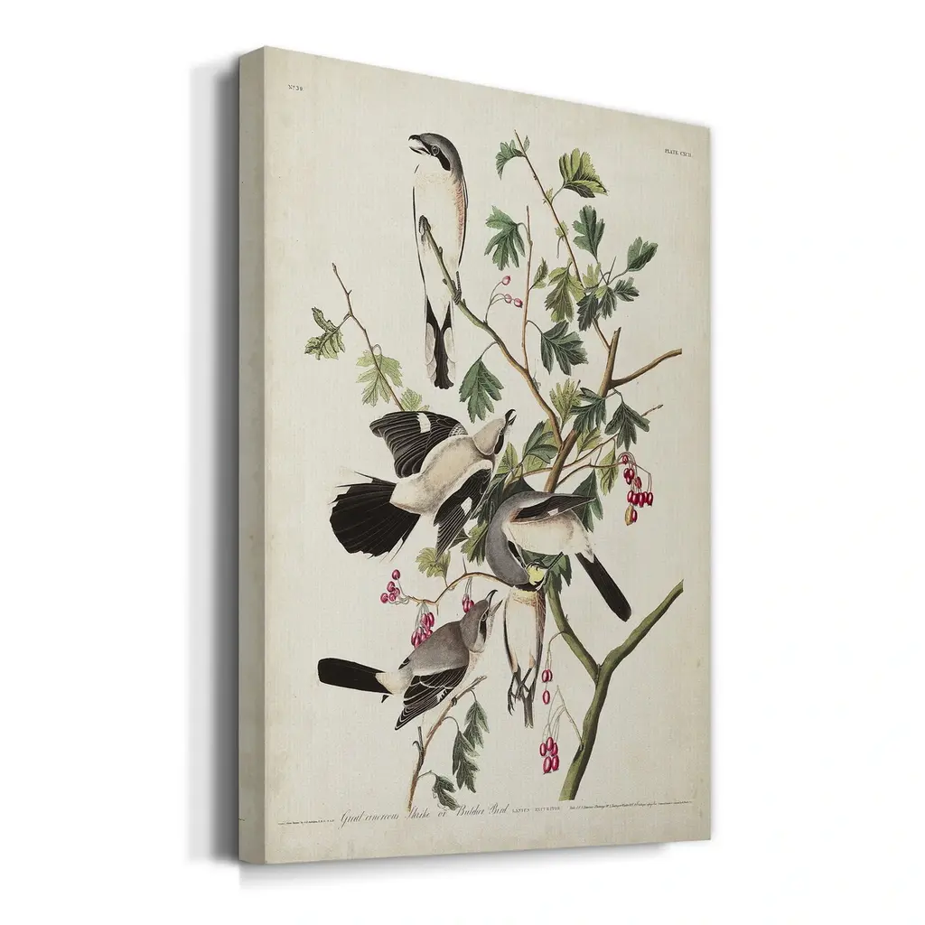 Pl 192 Great Cinereous Shrike Premium Gallery Wrapped Canvas - Ready to Hang A premium hand stretched gallery wrapped canvas print created to last. Featuring a beveled a solid wood stretcher bar, each piece comes ready to hand 5 SIZES AVAILABLE 8''X12'' - Overall Size 16'X20'' - Overall Size 24''x32'' - Overall Size 30''x40'' - Overall Size 36''x48'' - Overall Size Each piece is made to order. Built to Last Each piece comes ready to hang Solid wood stretcher Fade and Water resistant Made domestically