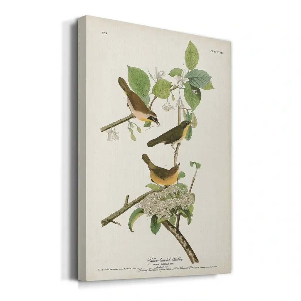 Pl. 23 Yellow-breasted Warbler Premium Gallery Wrapped Canvas - Ready to Hang A premium hand stretched gallery wrapped canvas print created to last. Featuring a beveled a solid wood stretcher bar, each piece comes ready to hand 5 SIZES AVAILABLE 8''X12'' - Overall Size 16'X20'' - Overall Size 24''x32'' - Overall Size 30''x40'' - Overall Size 36''x48'' - Overall Size Each piece is made to order. Built to Last Each piece comes ready to hang Solid wood stretcher Fade and Water resistant Made domestically
