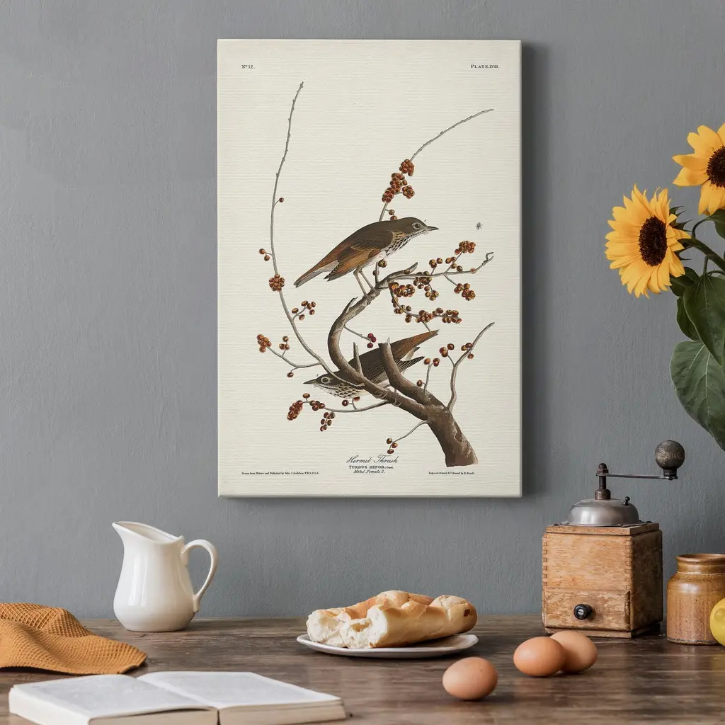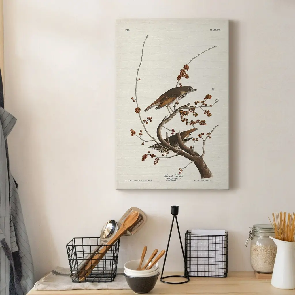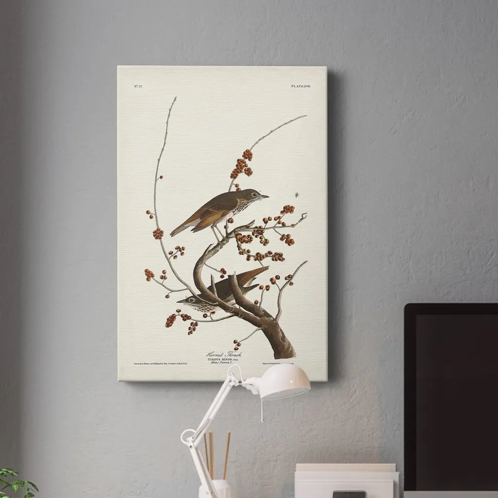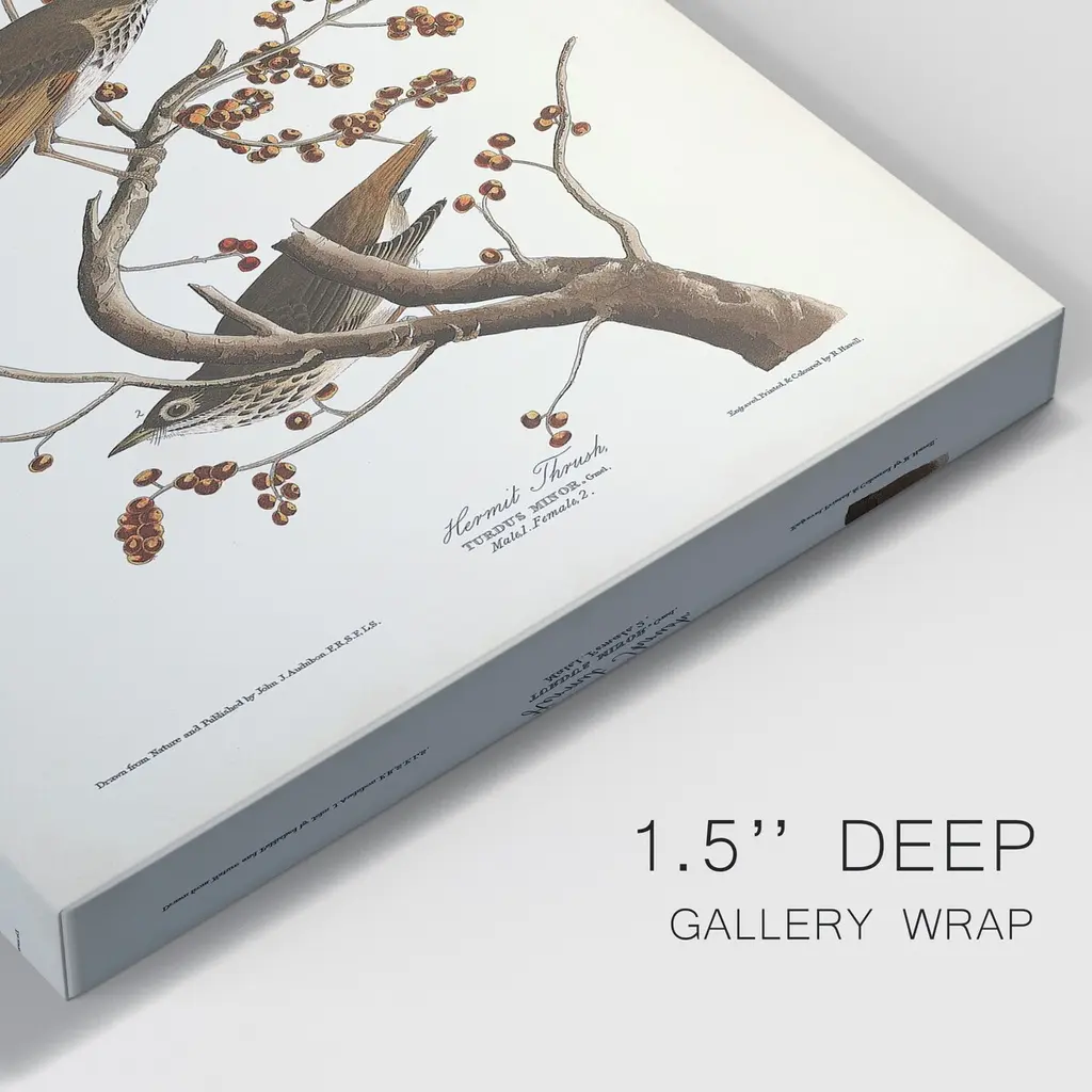 Pl. 58 Hermit Thrush Premium Gallery Wrapped Canvas - Ready to Hang A premium hand stretched gallery wrapped canvas print created to last. Featuring a beveled a solid wood stretcher bar, each piece comes ready to hand 5 SIZES AVAILABLE 8''X12'' - Overall Size 16'X20'' - Overall Size 24''x32'' - Overall Size 30''x40'' - Overall Size 36''x48'' - Overall Size Each piece is made to order. Built to Last Each piece comes ready to hang Solid wood stretcher Fade and Water resistant Made domestically