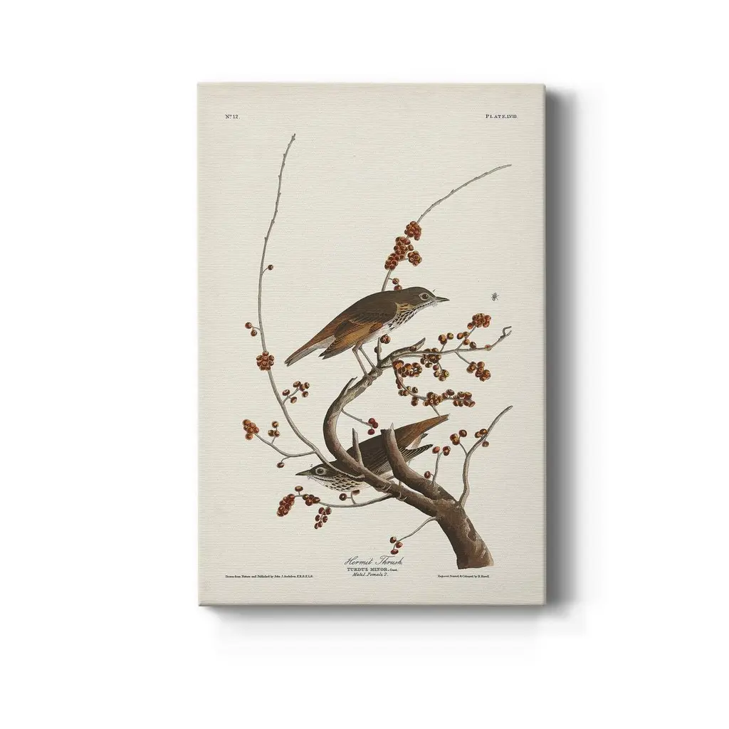 Pl. 58 Hermit Thrush Premium Gallery Wrapped Canvas - Ready to Hang A premium hand stretched gallery wrapped canvas print created to last. Featuring a beveled a solid wood stretcher bar, each piece comes ready to hand 5 SIZES AVAILABLE 8''X12'' - Overall Size 16'X20'' - Overall Size 24''x32'' - Overall Size 30''x40'' - Overall Size 36''x48'' - Overall Size Each piece is made to order. Built to Last Each piece comes ready to hang Solid wood stretcher Fade and Water resistant Made domestically