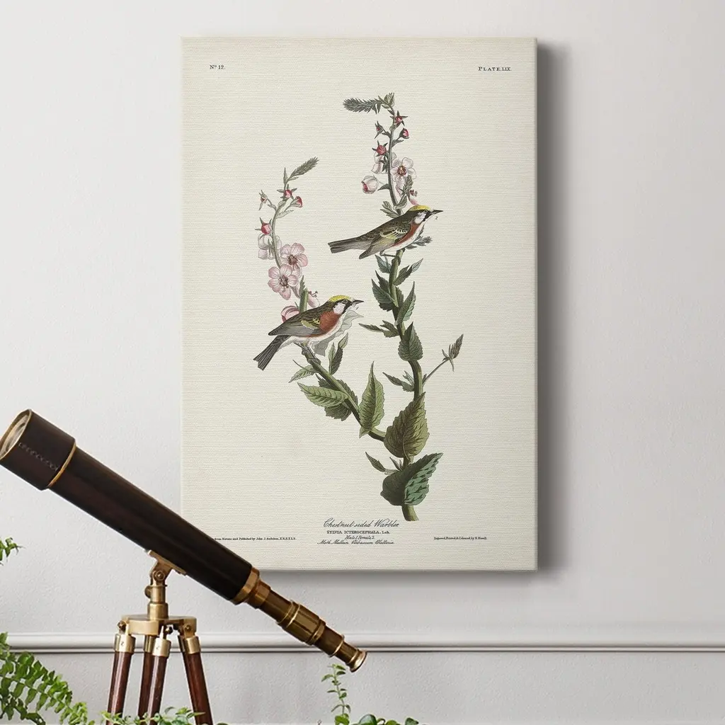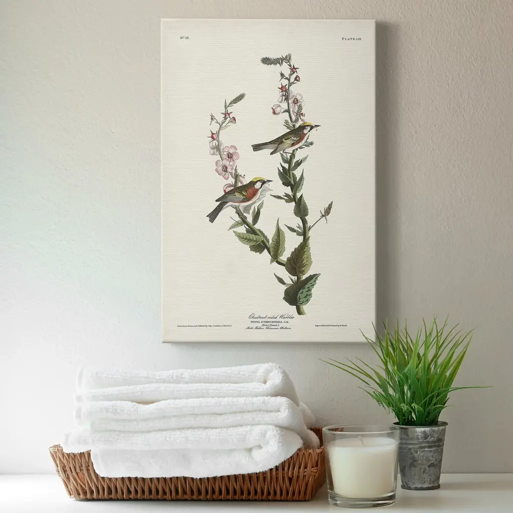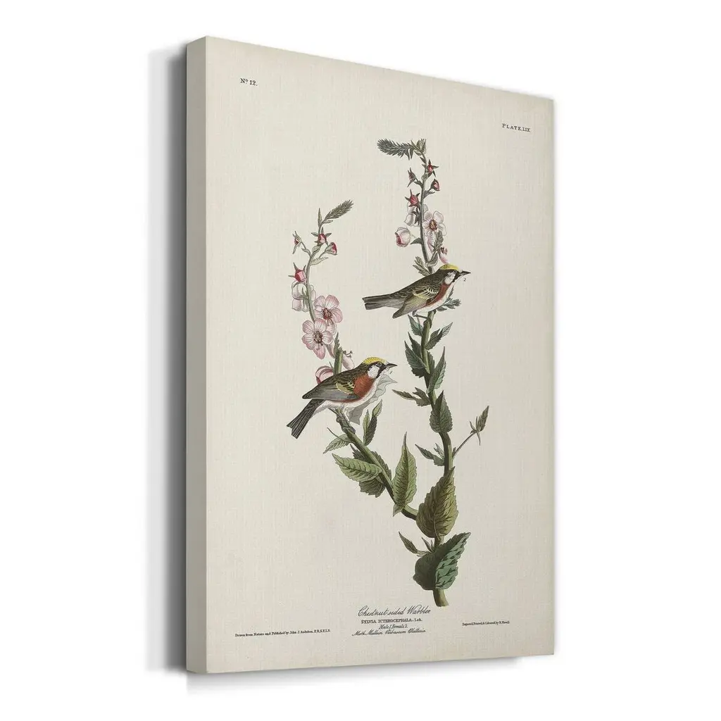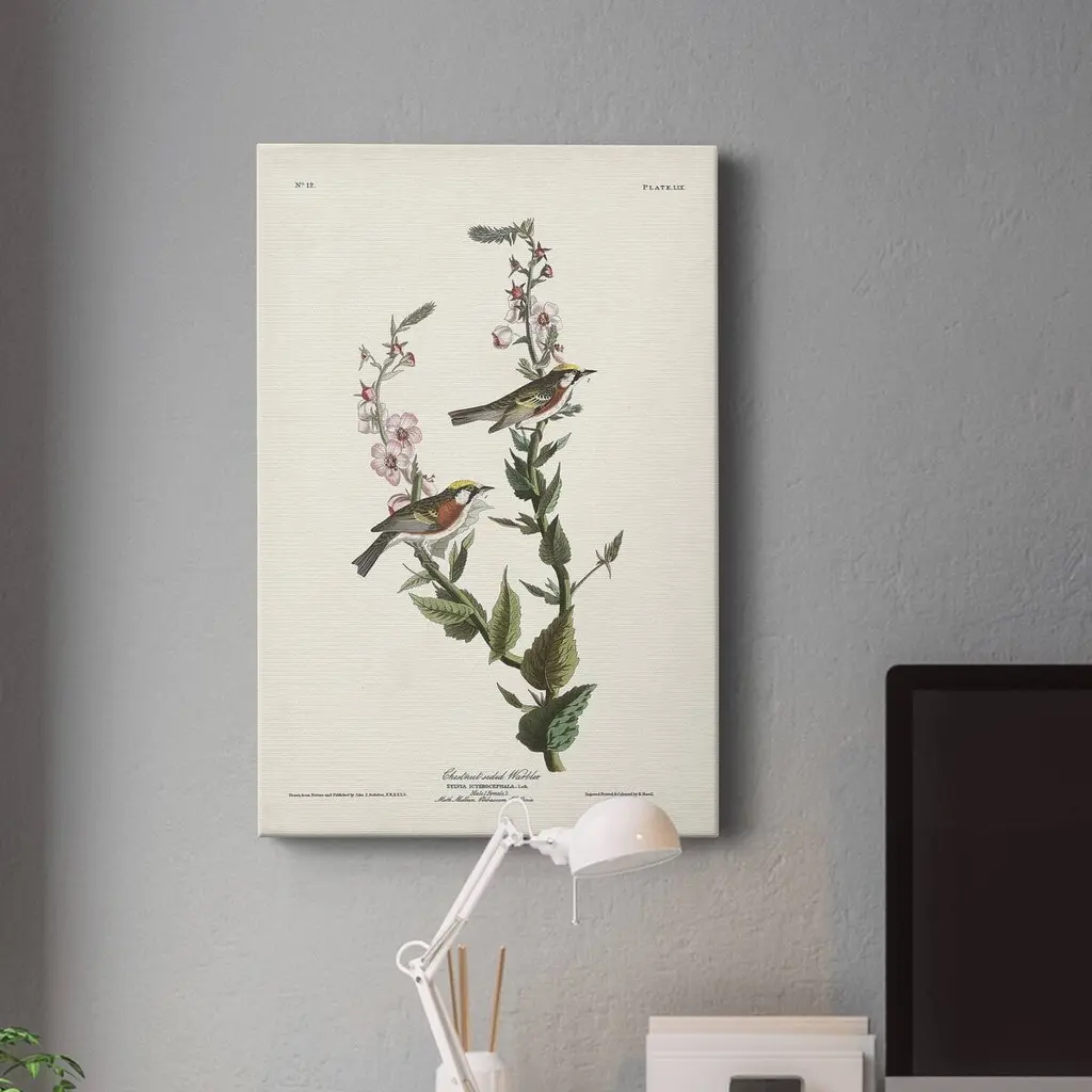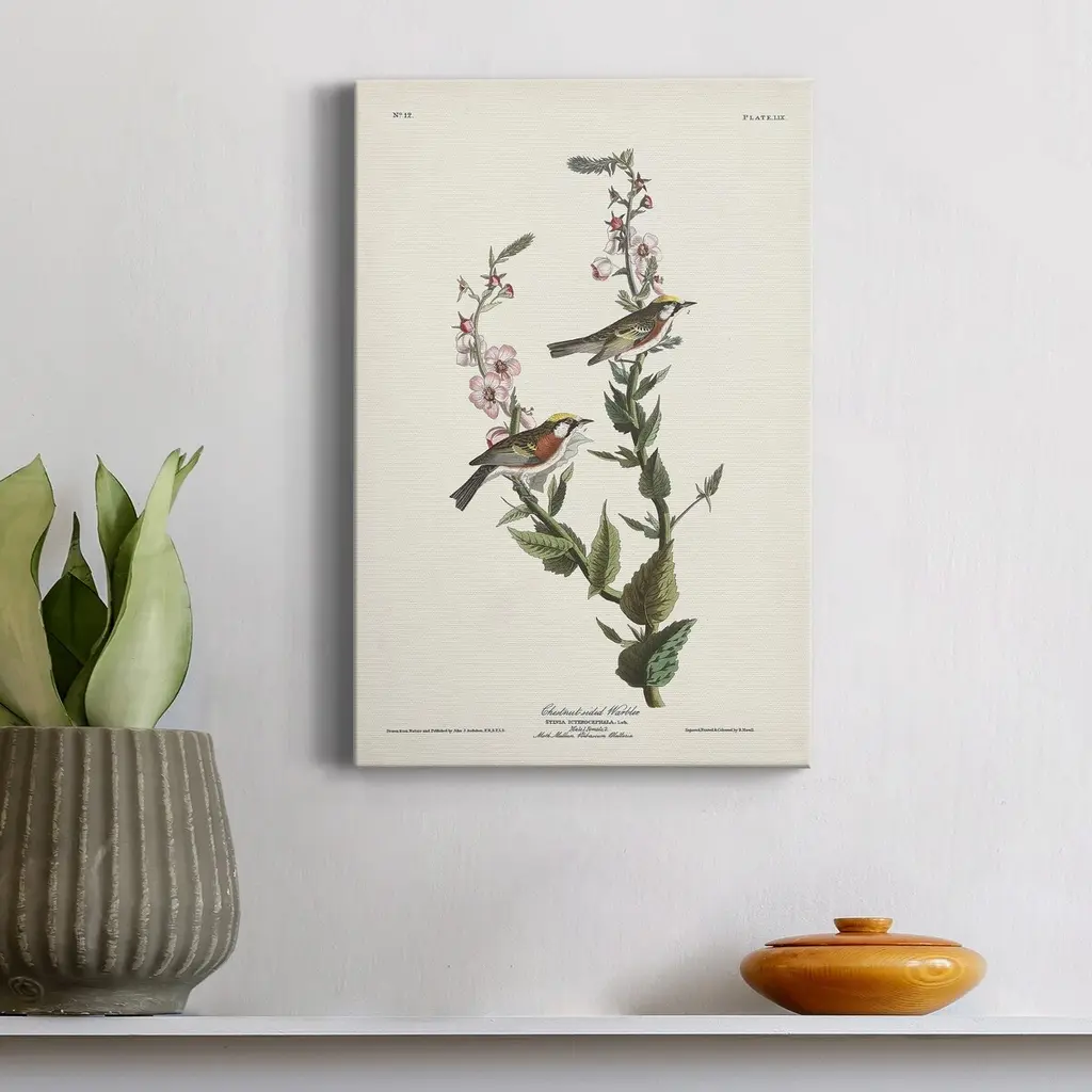 Pl. 59 Chestnut-sided Warbler Premium Gallery Wrapped Canvas - Ready to Hang A premium hand stretched gallery wrapped canvas print created to last. Featuring a beveled a solid wood stretcher bar, each piece comes ready to hand 5 SIZES AVAILABLE 8''X12'' - Overall Size 16'X20'' - Overall Size 24''x32'' - Overall Size 30''x40'' - Overall Size 36''x48'' - Overall Size Each piece is made to order. Built to Last Each piece comes ready to hang Solid wood stretcher Fade and Water resistant Made domestically