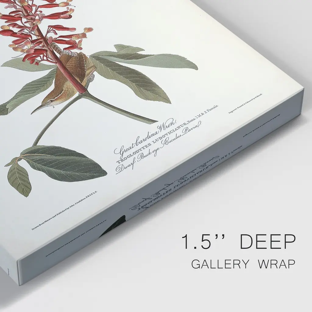 Pl. 78 Great Carolina Wren Premium Gallery Wrapped Canvas - Ready to Hang A premium hand stretched gallery wrapped canvas print created to last. Featuring a beveled a solid wood stretcher bar, each piece comes ready to hand 5 SIZES AVAILABLE 8''X12'' - Overall Size 16'X20'' - Overall Size 24''x32'' - Overall Size 30''x40'' - Overall Size 36''x48'' - Overall Size Each piece is made to order. Built to Last Each piece comes ready to hang Solid wood stretcher Fade and Water resistant Made domestically