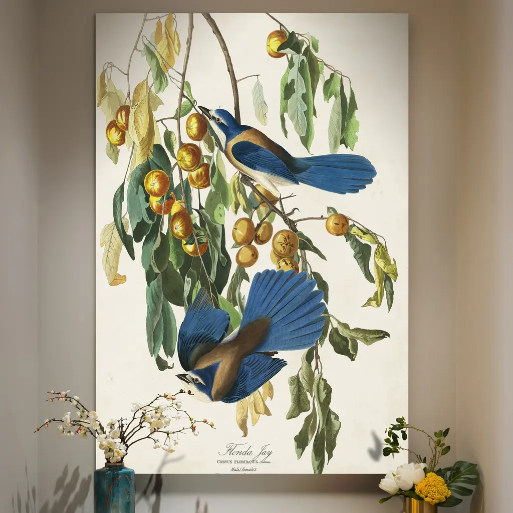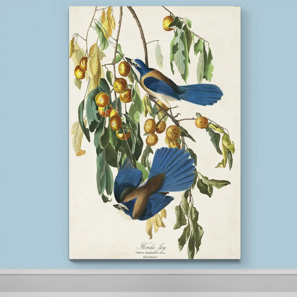 Pl 87 Florida Jay -Premium Gallery Wrapped Canvas - Ready to Hang A premium hand stretched gallery wrapped canvas print created to last. Featuring a beveled a solid wood stretcher bar, each piece comes ready to hand 5 SIZES AVAILABLE 8''X12'' - Overall Size 16''x20'' - Overall Size 18''x27'' - Overall Size 24''x36'' - Overall Size 32''x48'' - Overall Size Each piece is made to order. Built to Last Each piece comes ready to hang Solid wood stretcher Fade and Water resistant Made domestically