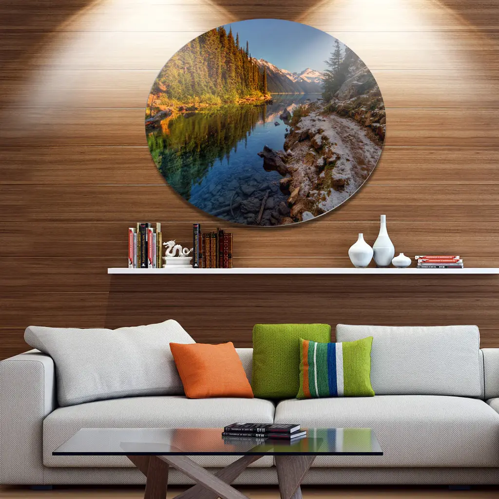 Bring Contemporary Abstraction to your home with this large Circle Metal wall art. This Placid Lake between Mountains Metal Artwork makes it the focal point of any room or office. - White Gloss Coating ensures colors are extra vibrant with light reflection.- Aluminum grade Sheet Metal with 1 inch mounting frame on the back giving the illusion that the artwork is floating on the wall..- Mounting Brackets are included along with instructions.- High Quality Digital images are created directly into a glossy aluminum panel producing a stunning and captivating print into the glossy finish of the metal.- Water, Fire and Scratch resistant HD Aluminum panels.- Looks better than any photo paper and guaranteed to last at least 20 years- Easy to clean with a microfiber cloth. Colors are far superior to regular Canvas Art. - Easy to Hang