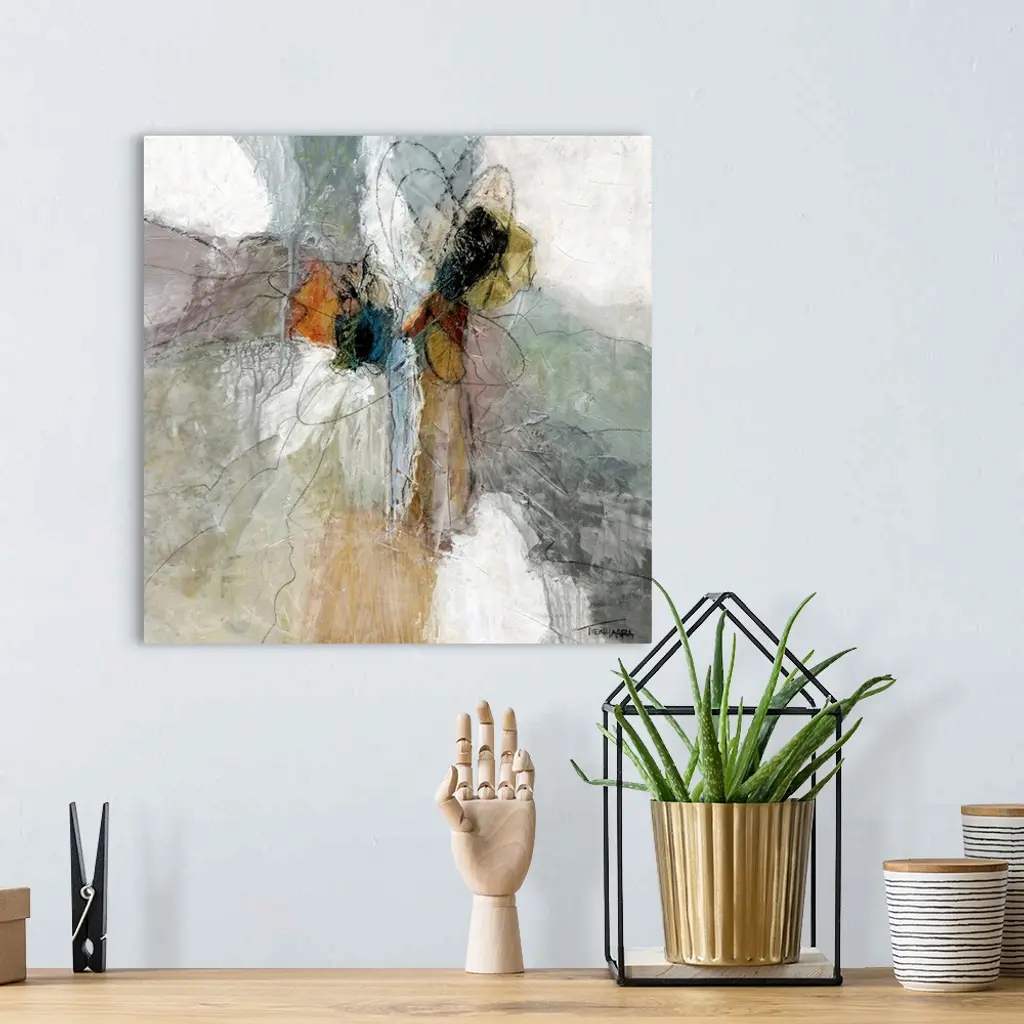 Textured square abstract painting with muted pastel colors in sections around the canvas and thin black squiggly lines on top.