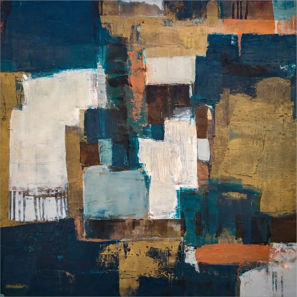 Abstract painting with bold colorful paint strokes covering one half of the piece and cream colored tones covering the other.