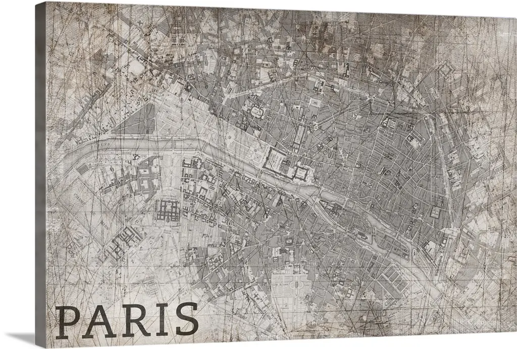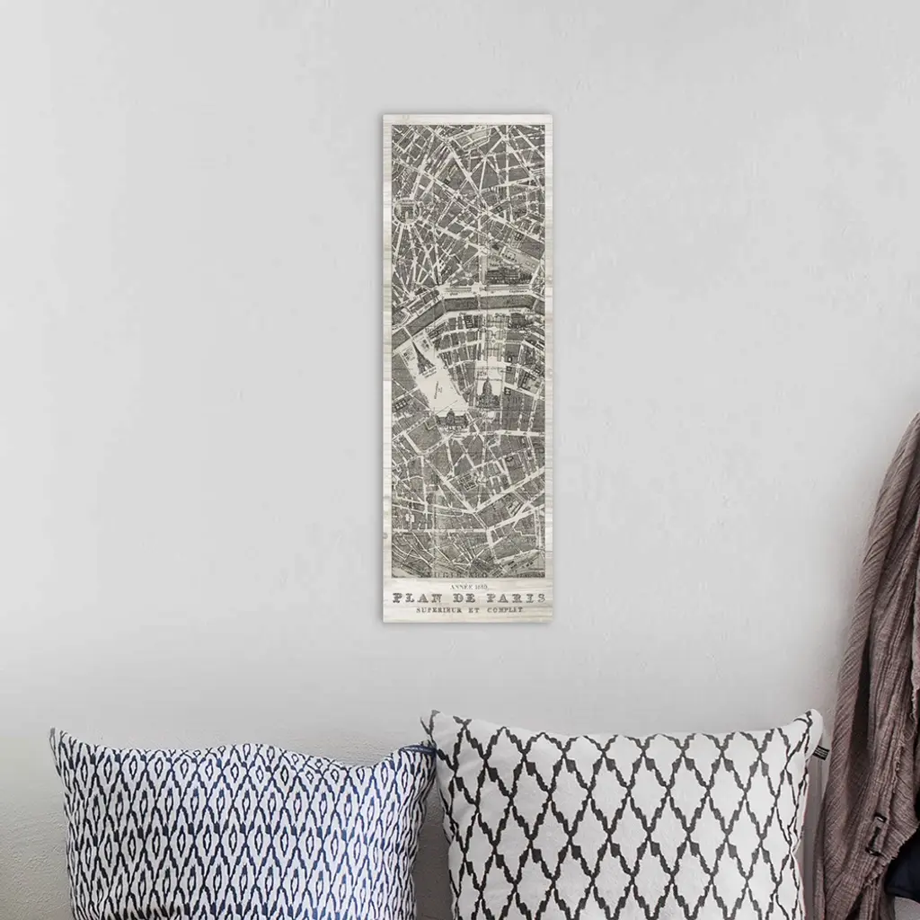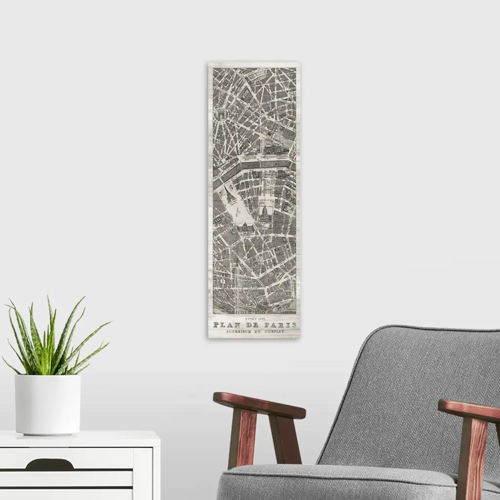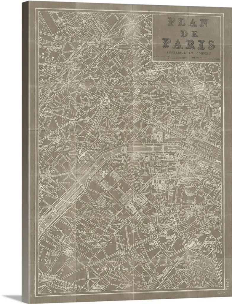 Decorative artwork of a vintage map of Paris featuring the words, 'Plan de Paris, Superieur Et Complet'.