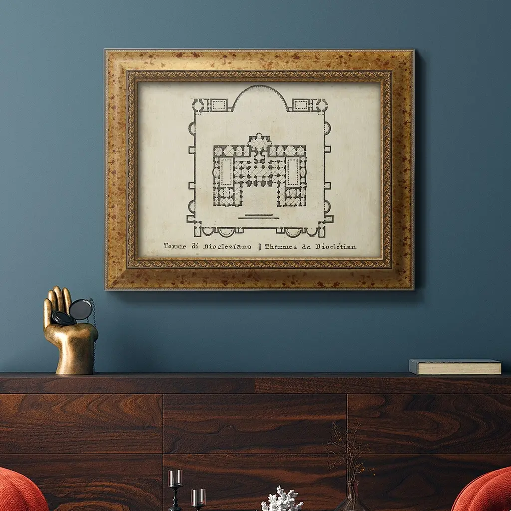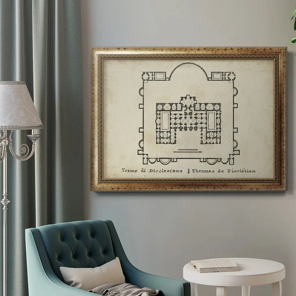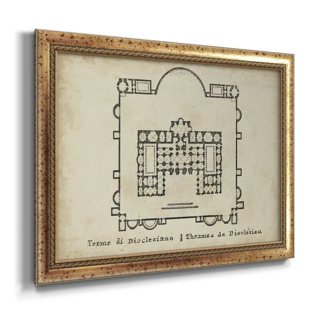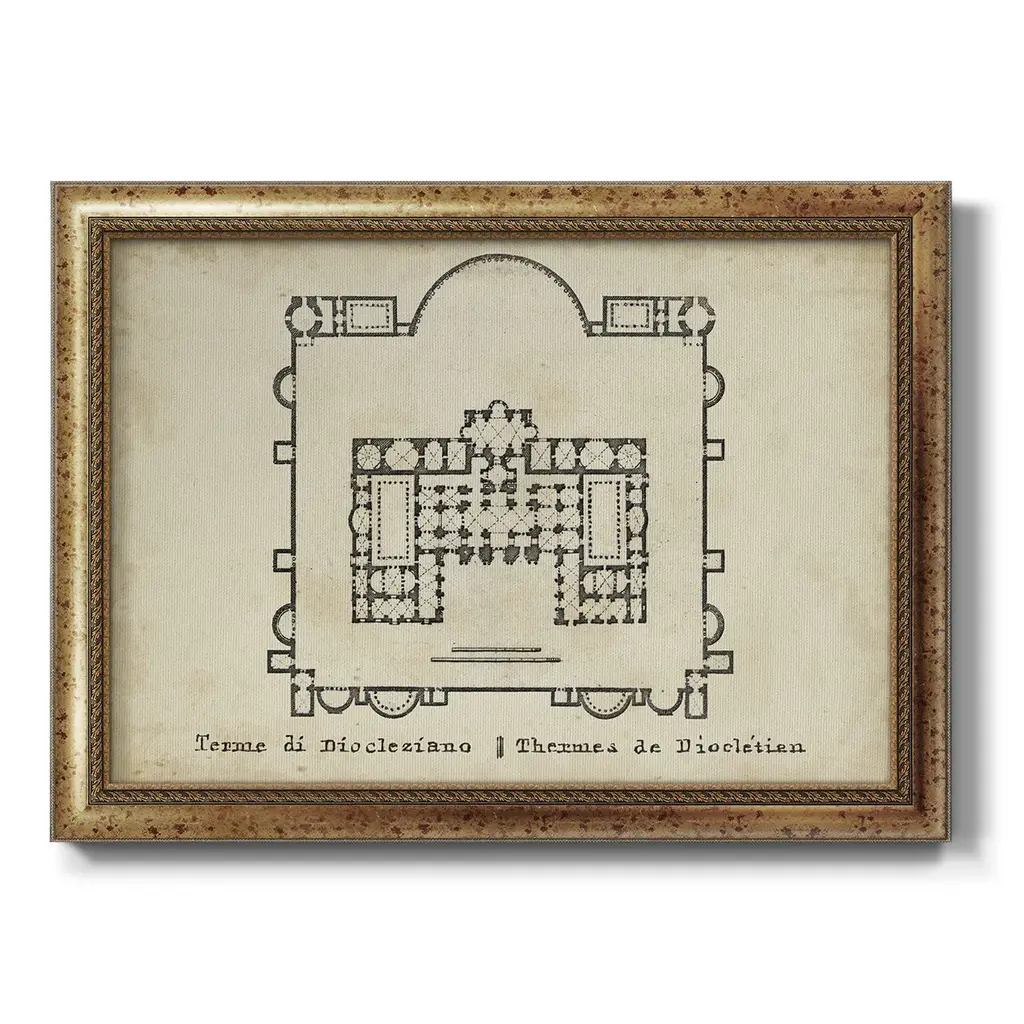 Plan for the Baths of Diocletian Premium Framed Canvas- Ready to Hang A Premium Framed Canvas created to last. Framed in distressed wood and available in an array of sizes and colors Featuring a beveled a solid wood stretcher bar, each piece comes ready to hand 3 SIZES AVAILABLE 16''X20'' - Overall Size 18'X27'' - Overall Size 24''x36'' - Overall Size Each piece is made to order. Each piece comes with hanging hardware. Made in the USA Ready to Hang Giclee Paper Print Acrylic Glass Beveled Matt Board