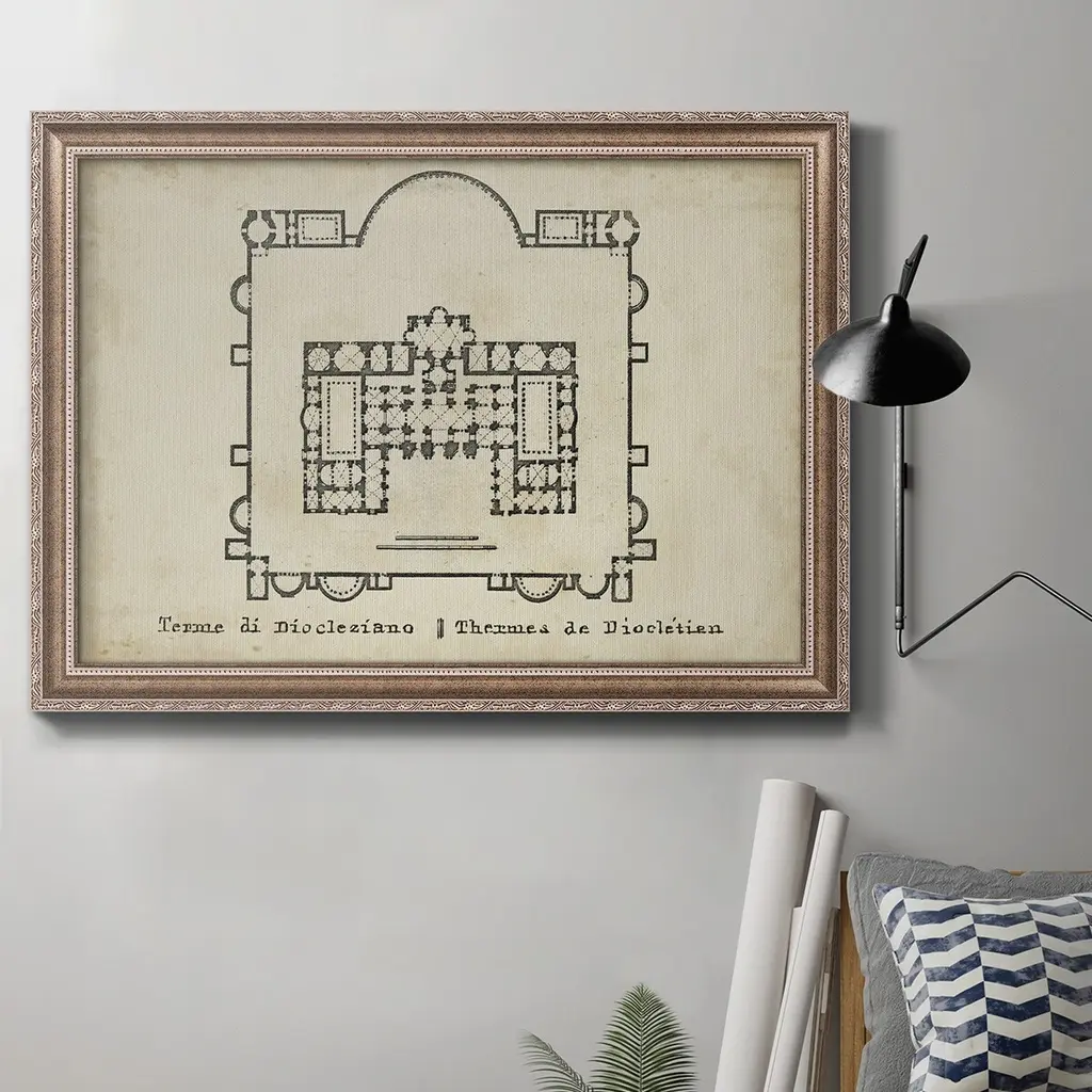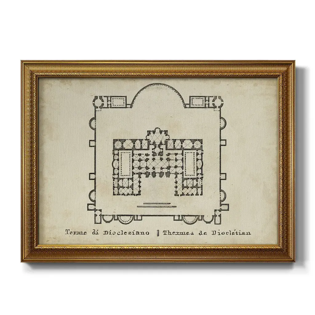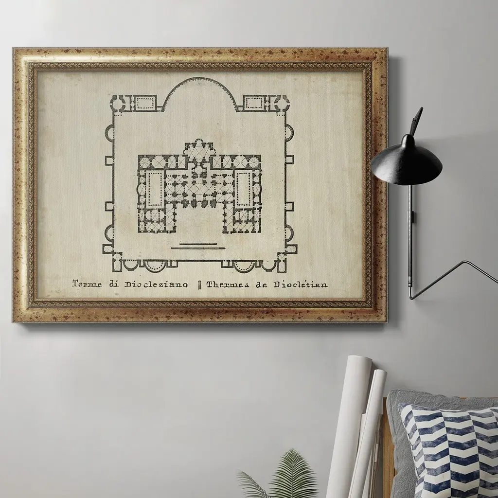 Plan for the Baths of Diocletian Premium Framed Canvas- Ready to Hang A Premium Framed Canvas created to last. Framed in distressed wood and available in an array of sizes and colors Featuring a beveled a solid wood stretcher bar, each piece comes ready to hand 3 SIZES AVAILABLE 16''X20'' - Overall Size 18'X27'' - Overall Size 24''x36'' - Overall Size Each piece is made to order. Each piece comes with hanging hardware. Made in the USA Ready to Hang Giclee Paper Print Acrylic Glass Beveled Matt Board