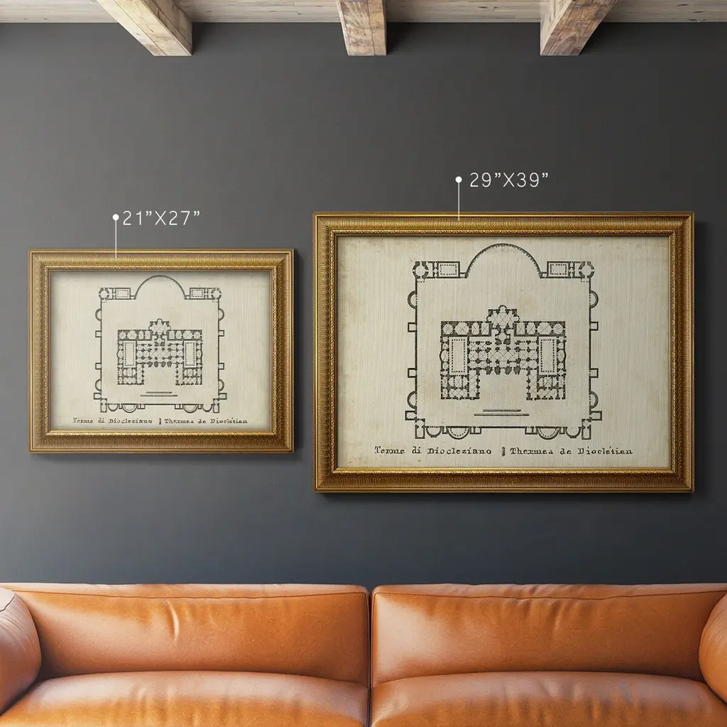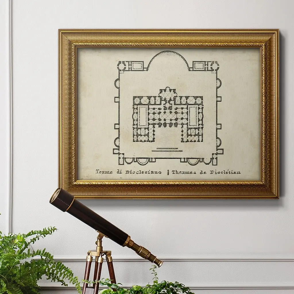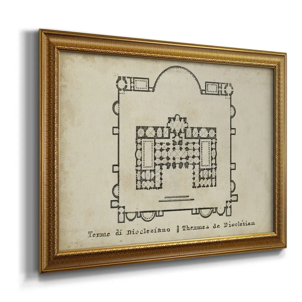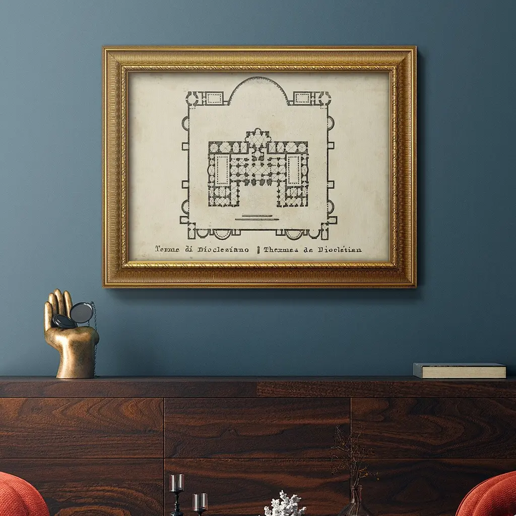 Plan for the Baths of Diocletian Premium Framed Canvas- Ready to Hang A Premium Framed Canvas created to last. Framed in distressed wood and available in an array of sizes and colors Featuring a beveled a solid wood stretcher bar, each piece comes ready to hand 3 SIZES AVAILABLE 16''X20'' - Overall Size 18'X27'' - Overall Size 24''x36'' - Overall Size Each piece is made to order. Each piece comes with hanging hardware. Made in the USA Ready to Hang Giclee Paper Print Acrylic Glass Beveled Matt Board