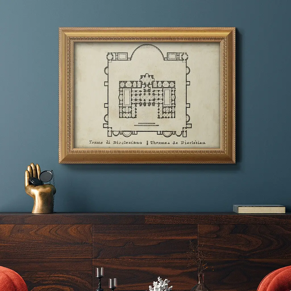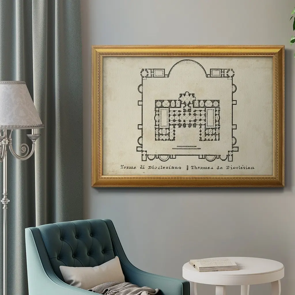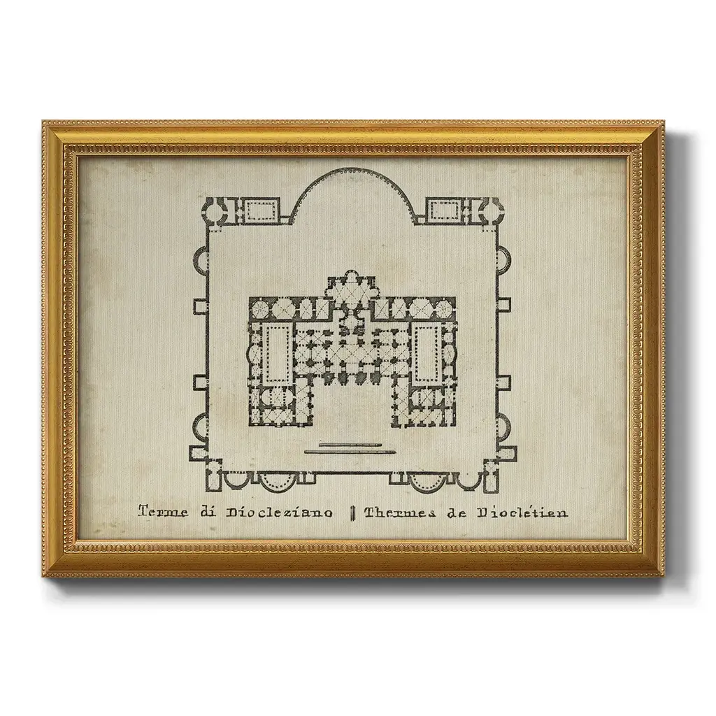 Plan for the Baths of Diocletian Premium Framed Canvas- Ready to Hang A Premium Framed Canvas created to last. Framed in distressed wood and available in an array of sizes and colors Featuring a beveled a solid wood stretcher bar, each piece comes ready to hand 3 SIZES AVAILABLE 16''X20'' - Overall Size 18'X27'' - Overall Size 24''x36'' - Overall Size Each piece is made to order. Each piece comes with hanging hardware. Made in the USA Ready to Hang Giclee Paper Print Acrylic Glass Beveled Matt Board
