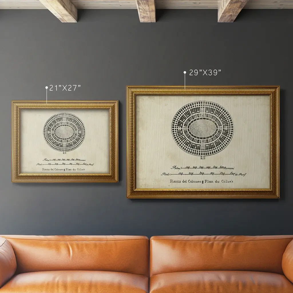 Plan for the Colosseum Premium Framed Canvas- Ready to Hang A Premium Framed Canvas created to last. Framed in distressed wood and available in an array of sizes and colors Featuring a beveled a solid wood stretcher bar, each piece comes ready to hand 3 SIZES AVAILABLE 16''X20'' - Overall Size 18'X27'' - Overall Size 24''x36'' - Overall Size Each piece is made to order. Each piece comes with hanging hardware. Made in the USA Ready to Hang Giclee Paper Print Acrylic Glass Beveled Matt Board
