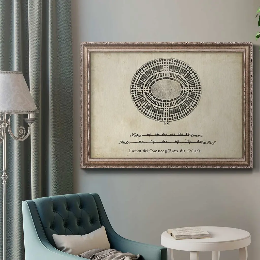 Plan for the Colosseum Premium Framed Canvas- Ready to Hang A Premium Framed Canvas created to last. Framed in distressed wood and available in an array of sizes and colors Featuring a beveled a solid wood stretcher bar, each piece comes ready to hand 3 SIZES AVAILABLE 16''X20'' - Overall Size 18'X27'' - Overall Size 24''x36'' - Overall Size Each piece is made to order. Each piece comes with hanging hardware. Made in the USA Ready to Hang Giclee Paper Print Acrylic Glass Beveled Matt Board