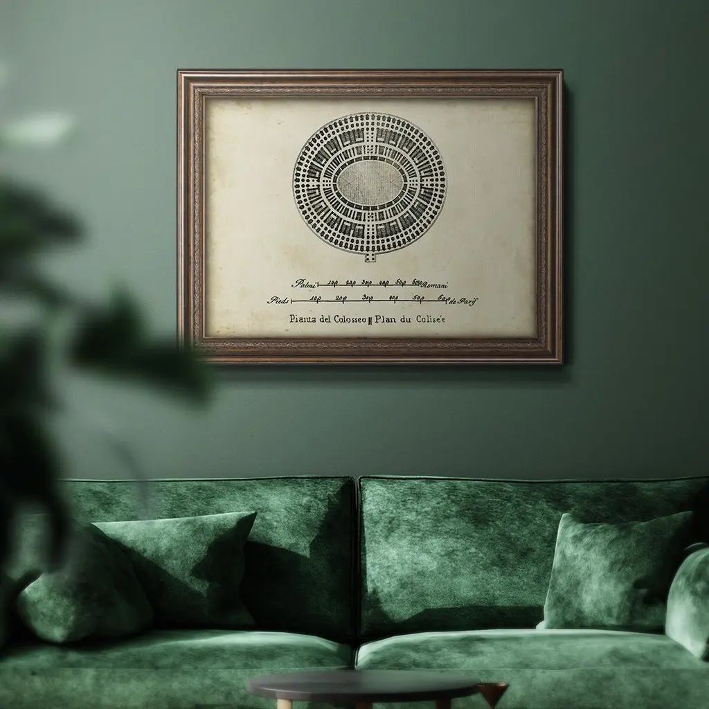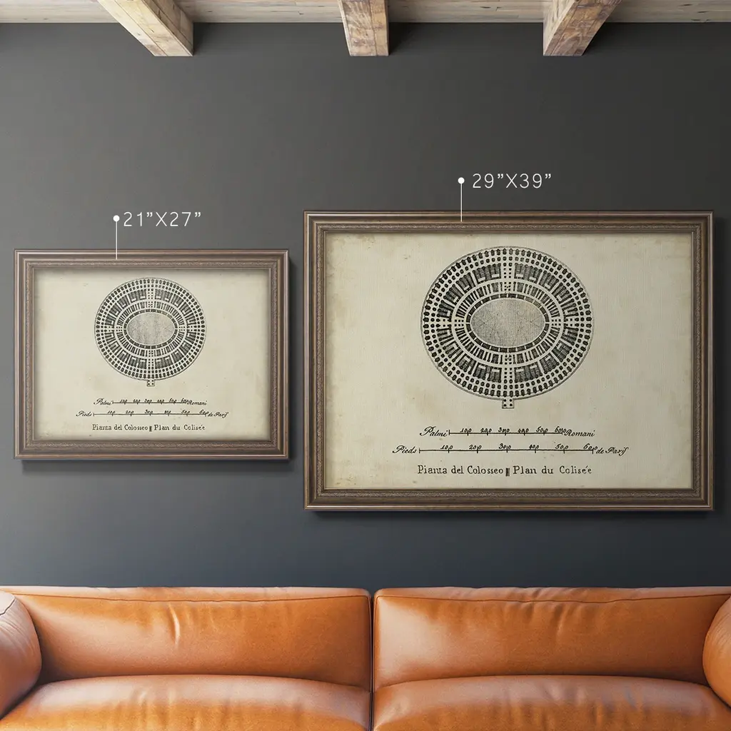 Plan for the Colosseum Premium Framed Canvas- Ready to Hang A Premium Framed Canvas created to last. Framed in distressed wood and available in an array of sizes and colors Featuring a beveled a solid wood stretcher bar, each piece comes ready to hand 3 SIZES AVAILABLE 16''X20'' - Overall Size 18'X27'' - Overall Size 24''x36'' - Overall Size Each piece is made to order. Each piece comes with hanging hardware. Made in the USA Ready to Hang Giclee Paper Print Acrylic Glass Beveled Matt Board
