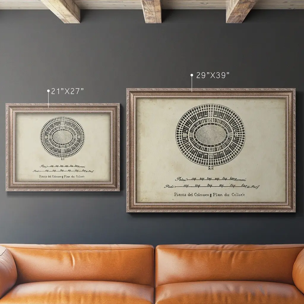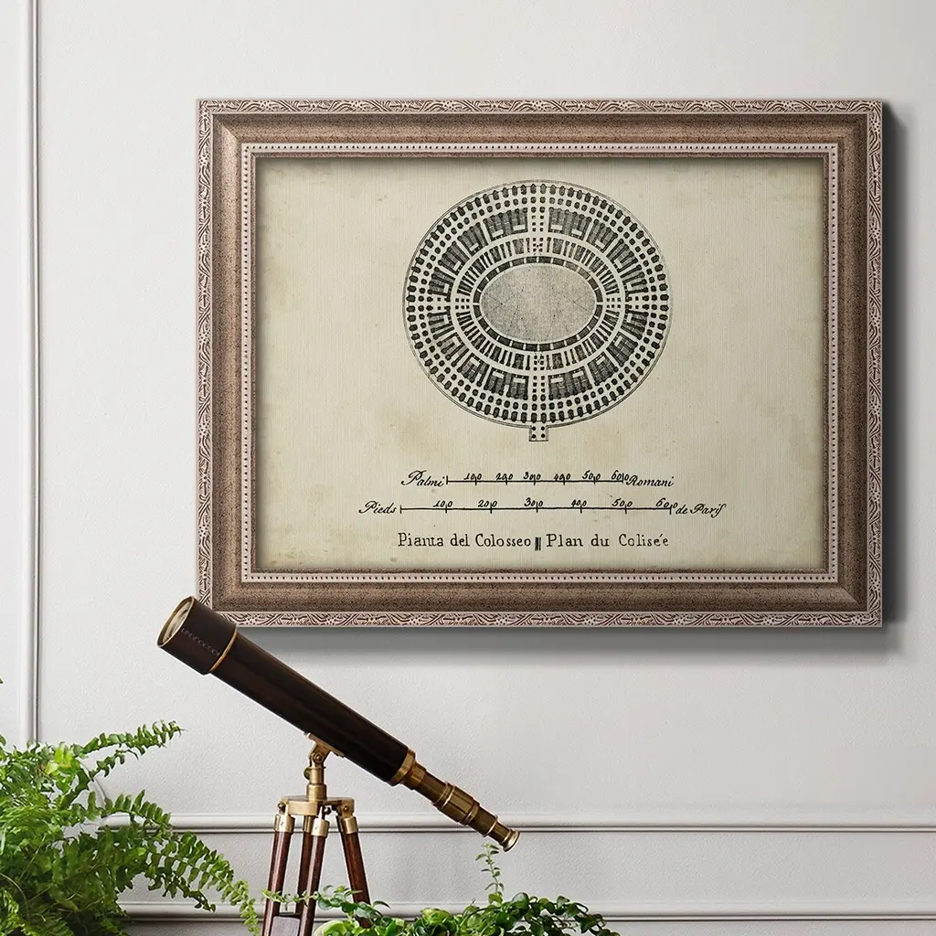 Plan for the Colosseum Premium Framed Canvas- Ready to Hang A Premium Framed Canvas created to last. Framed in distressed wood and available in an array of sizes and colors Featuring a beveled a solid wood stretcher bar, each piece comes ready to hand 3 SIZES AVAILABLE 16''X20'' - Overall Size 18'X27'' - Overall Size 24''x36'' - Overall Size Each piece is made to order. Each piece comes with hanging hardware. Made in the USA Ready to Hang Giclee Paper Print Acrylic Glass Beveled Matt Board