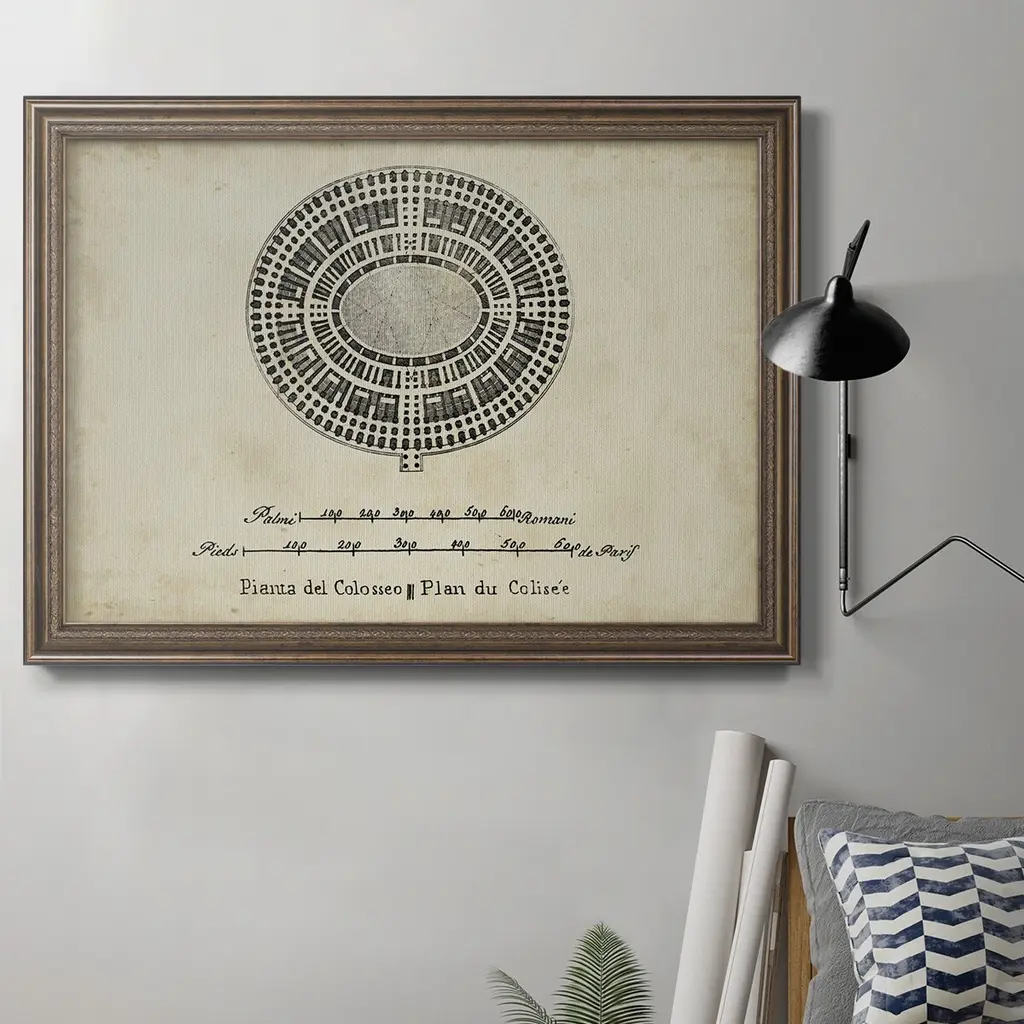 Plan for the Colosseum Premium Framed Canvas- Ready to Hang A Premium Framed Canvas created to last. Framed in distressed wood and available in an array of sizes and colors Featuring a beveled a solid wood stretcher bar, each piece comes ready to hand 3 SIZES AVAILABLE 16''X20'' - Overall Size 18'X27'' - Overall Size 24''x36'' - Overall Size Each piece is made to order. Each piece comes with hanging hardware. Made in the USA Ready to Hang Giclee Paper Print Acrylic Glass Beveled Matt Board