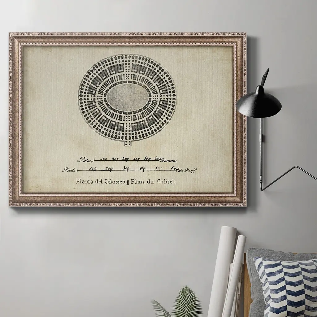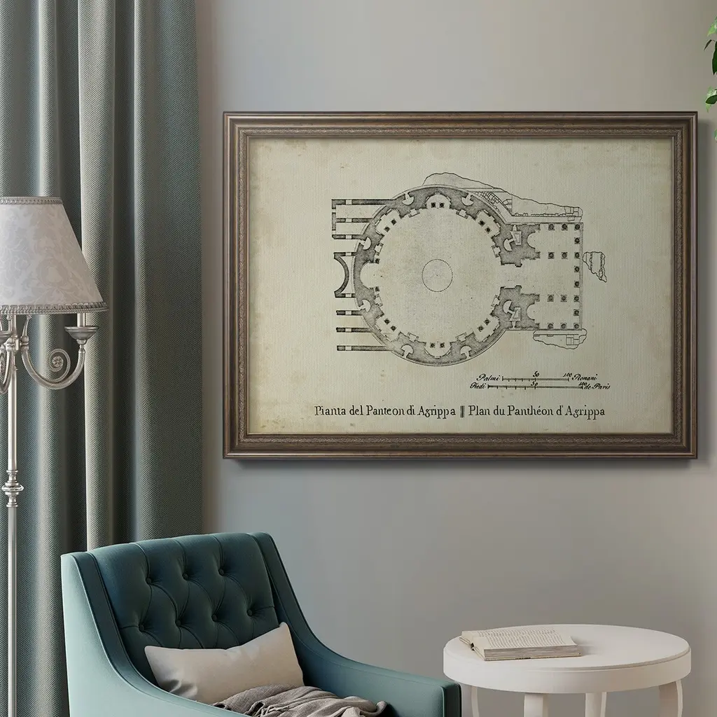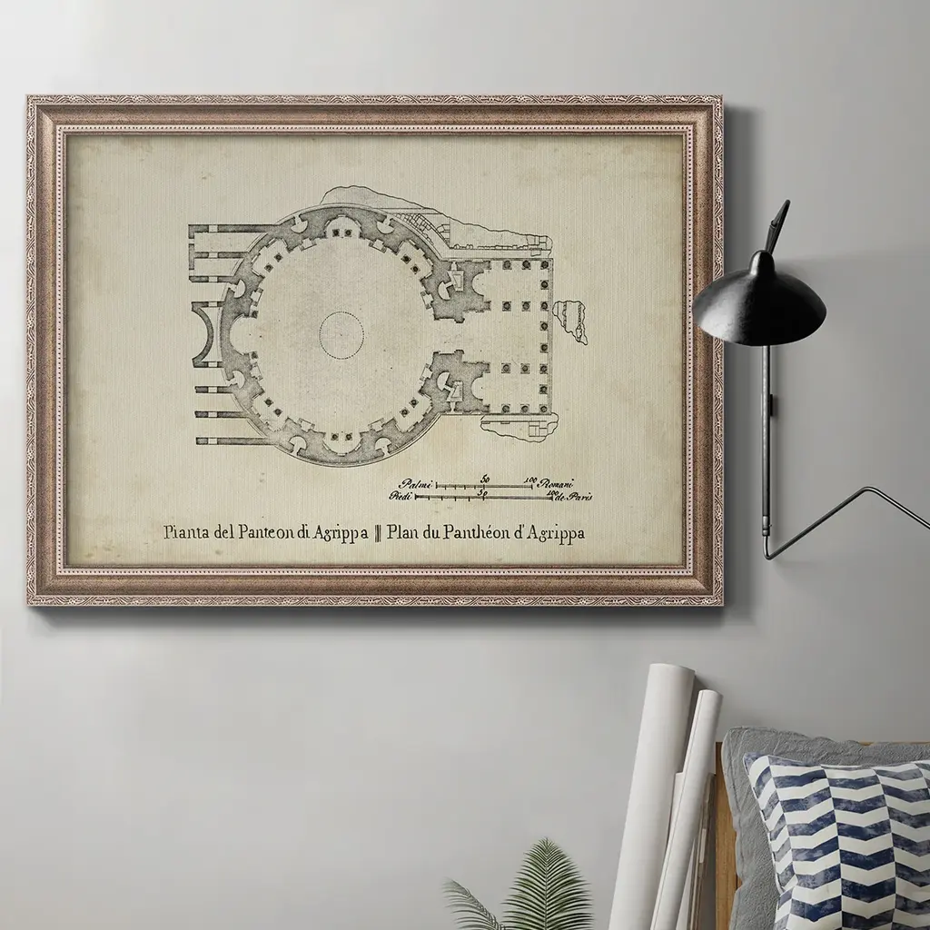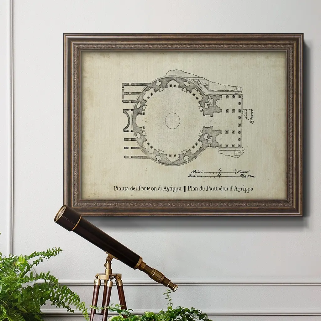 Plan for the Pantheon Premium Framed Canvas- Ready to Hang A Premium Framed Canvas created to last. Framed in distressed wood and available in an array of sizes and colors Featuring a beveled a solid wood stretcher bar, each piece comes ready to hand 3 SIZES AVAILABLE 16''X20'' - Overall Size 18'X27'' - Overall Size 24''x36'' - Overall Size Each piece is made to order. Each piece comes with hanging hardware. Made in the USA Ready to Hang Giclee Paper Print Acrylic Glass Beveled Matt Board