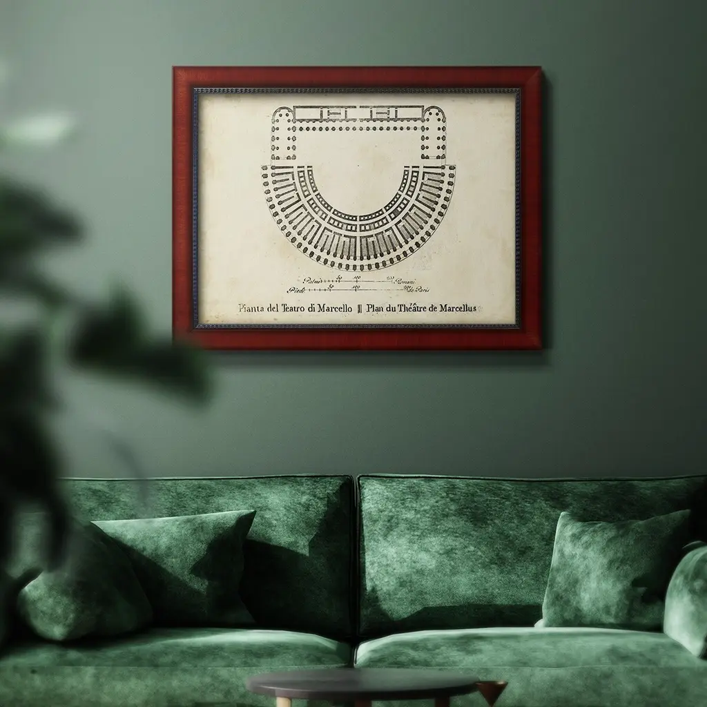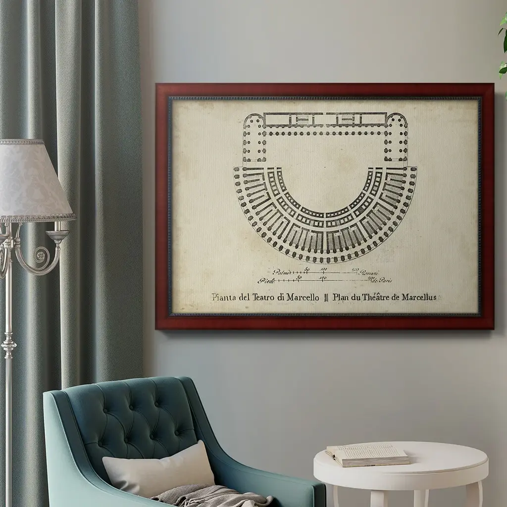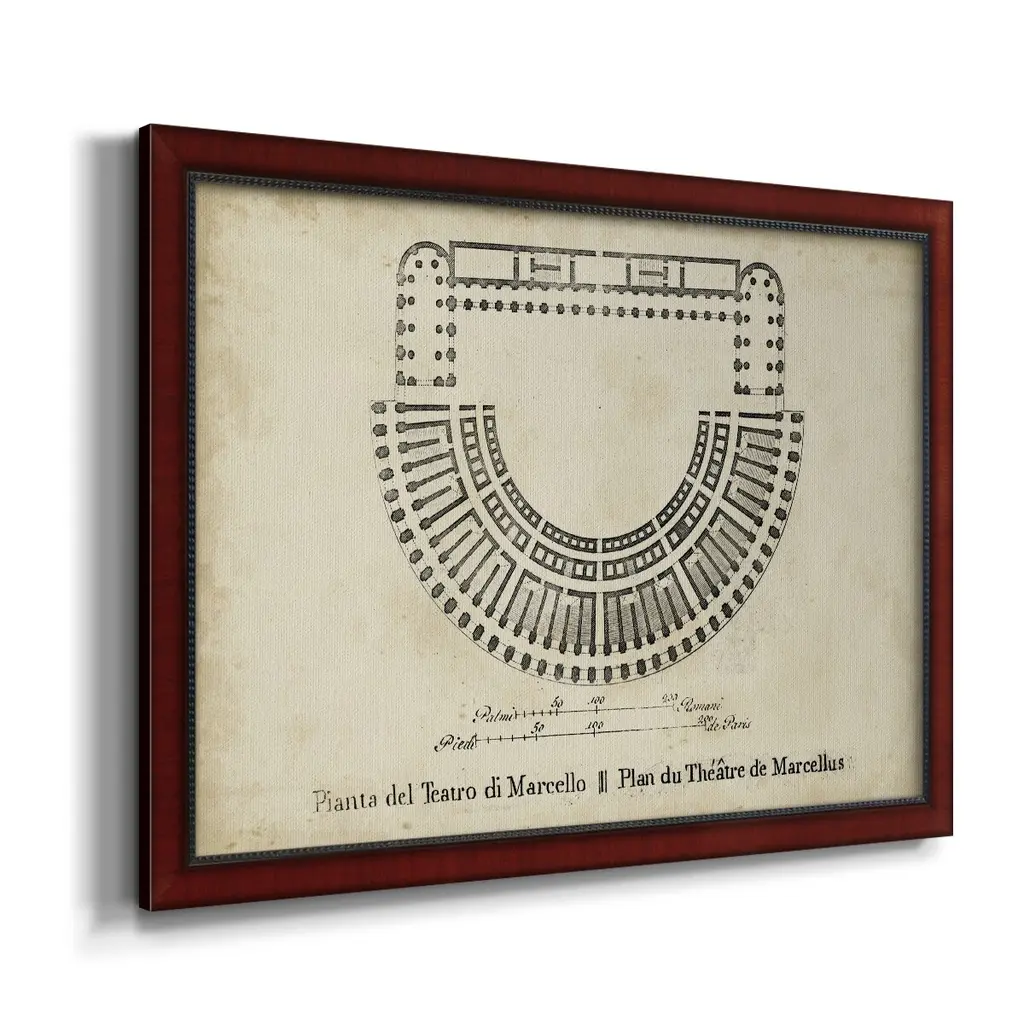 Plan for the Theatre of Marcellus Premium Framed Canvas- Ready to Hang A Premium Framed Canvas created to last. Framed in distressed wood and available in an array of sizes and colors Featuring a beveled a solid wood stretcher bar, each piece comes ready to hand 3 SIZES AVAILABLE 16''X20'' - Overall Size 18'X27'' - Overall Size 24''x36'' - Overall Size Each piece is made to order. Each piece comes with hanging hardware. Made in the USA Ready to Hang Giclee Paper Print Acrylic Glass Beveled Matt Board