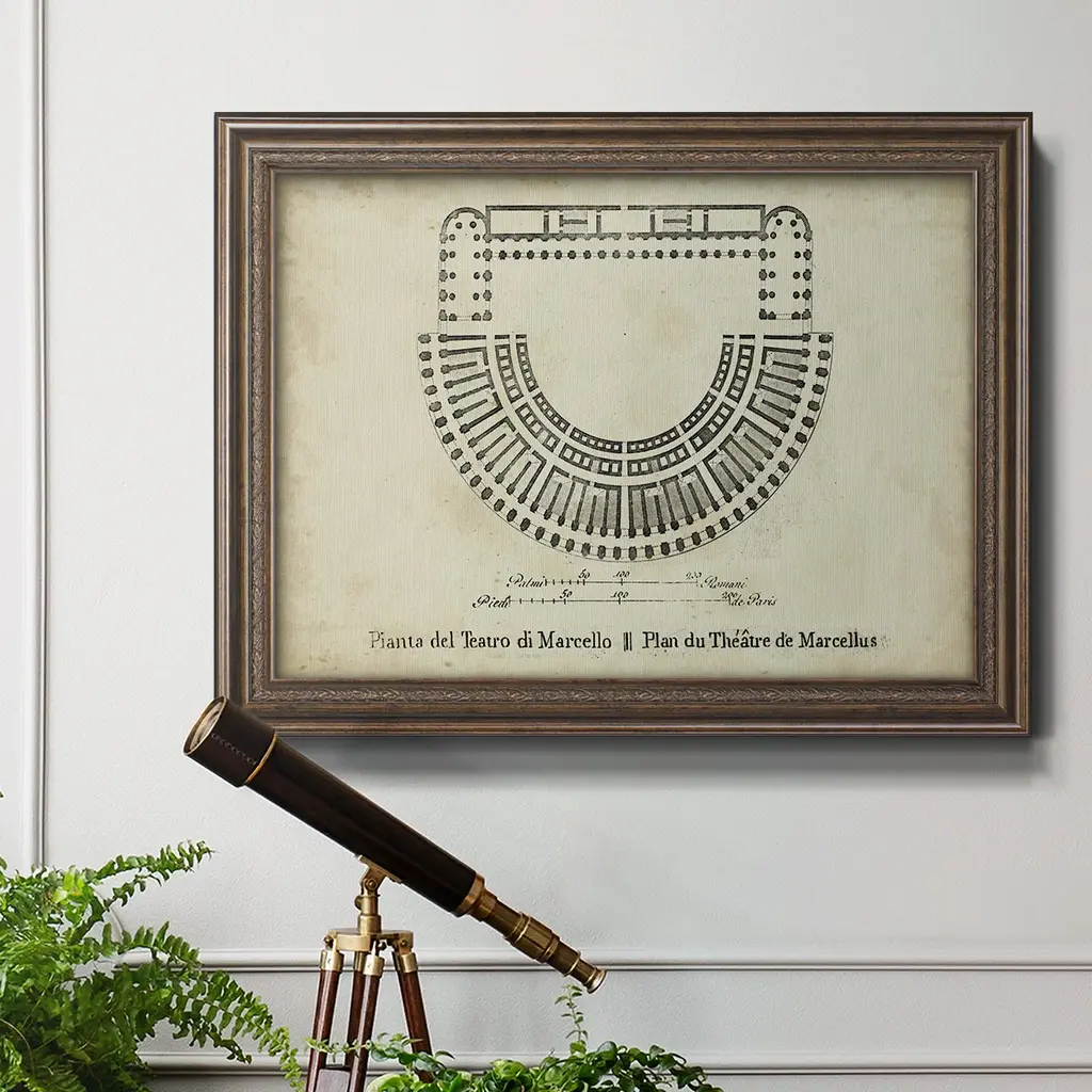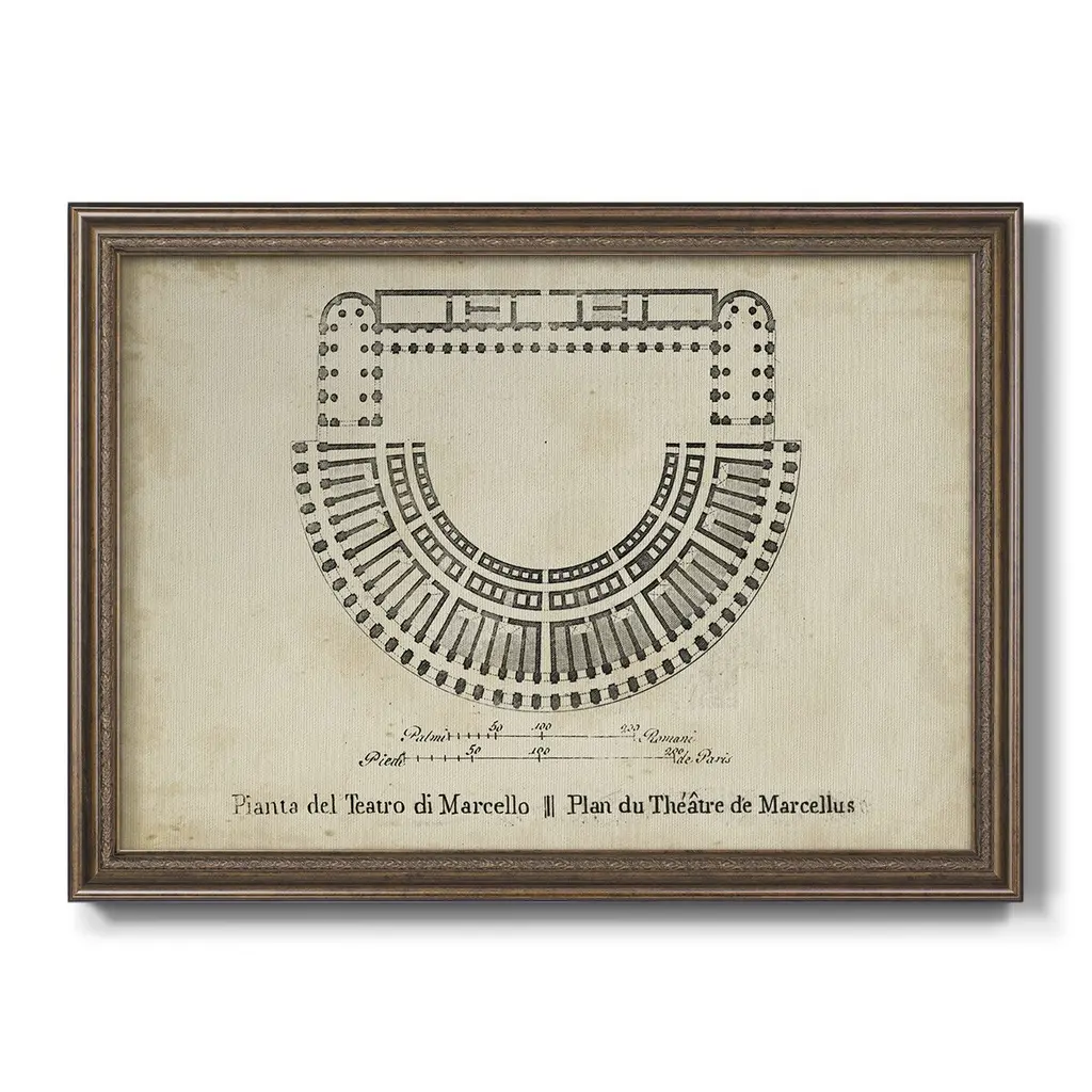 Plan for the Theatre of Marcellus Premium Framed Canvas- Ready to Hang A Premium Framed Canvas created to last. Framed in distressed wood and available in an array of sizes and colors Featuring a beveled a solid wood stretcher bar, each piece comes ready to hand 3 SIZES AVAILABLE 16''X20'' - Overall Size 18'X27'' - Overall Size 24''x36'' - Overall Size Each piece is made to order. Each piece comes with hanging hardware. Made in the USA Ready to Hang Giclee Paper Print Acrylic Glass Beveled Matt Board
