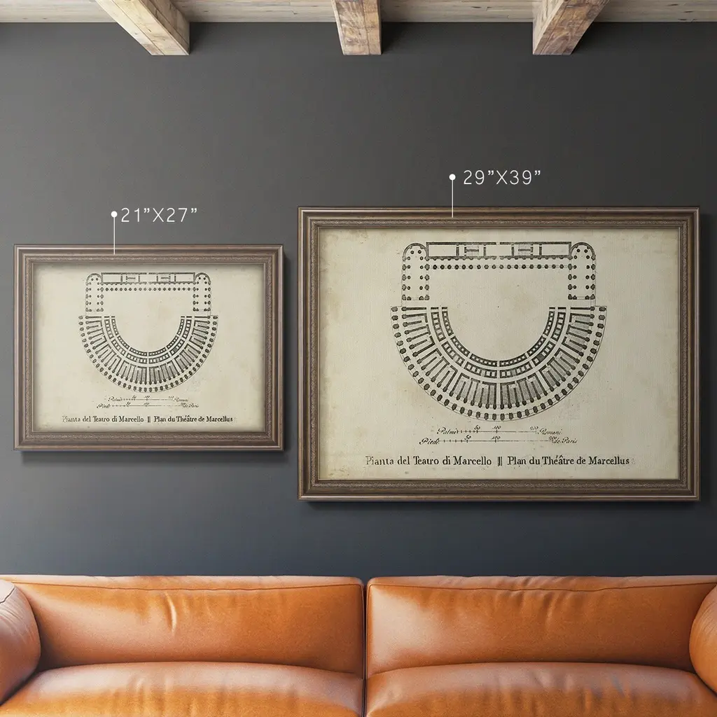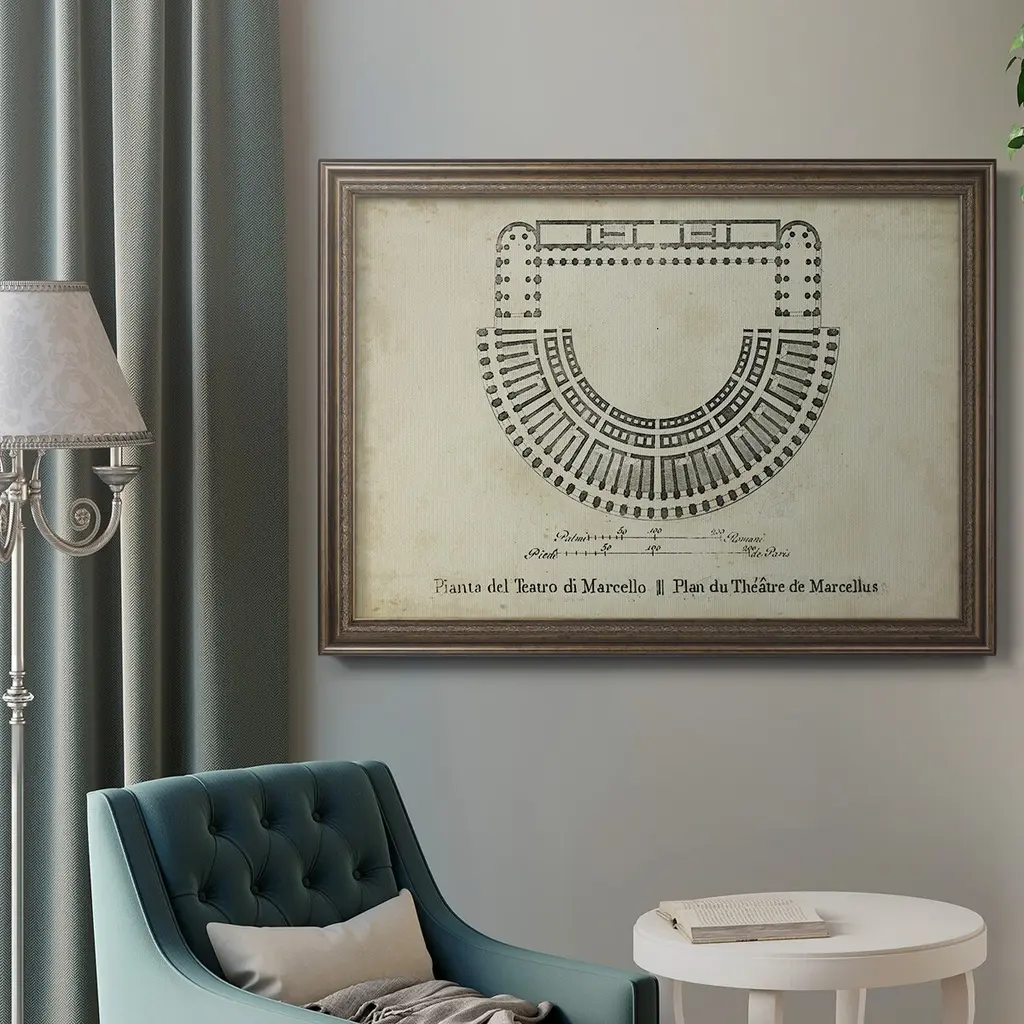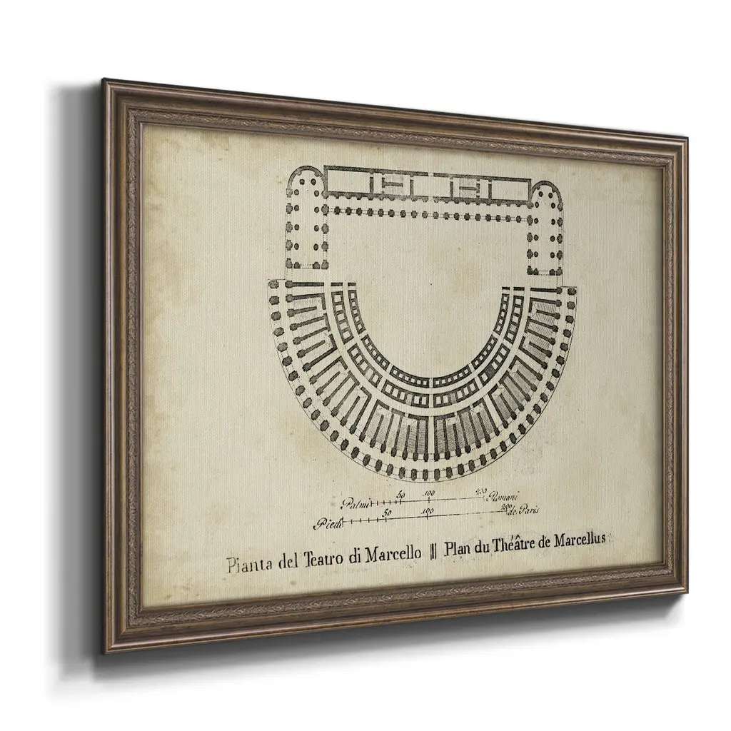 Plan for the Theatre of Marcellus Premium Framed Canvas- Ready to Hang A Premium Framed Canvas created to last. Framed in distressed wood and available in an array of sizes and colors Featuring a beveled a solid wood stretcher bar, each piece comes ready to hand 3 SIZES AVAILABLE 16''X20'' - Overall Size 18'X27'' - Overall Size 24''x36'' - Overall Size Each piece is made to order. Each piece comes with hanging hardware. Made in the USA Ready to Hang Giclee Paper Print Acrylic Glass Beveled Matt Board