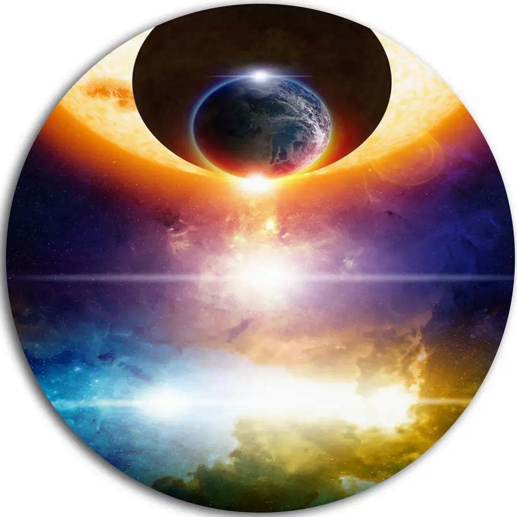 Bring Contemporary Abstraction to your home with this large Circle Metal wall art. This Planet and Comet in Space Metal Artwork makes it the focal point of any room or office. - White Gloss Coating ensures colors are extra vibrant with light reflection.- Aluminum grade Sheet Metal with 1 inch mounting frame on the back giving the illusion that the artwork is floating on the wall..- Mounting Brackets are included along with instructions.- High Quality Digital images are created directly into a glossy aluminum panel producing a stunning and captivating print into the glossy finish of the metal.- Water, Fire and Scratch resistant HD Aluminum panels.- Looks better than any photo paper and guaranteed to last at least 20 years- Easy to clean with a microfiber cloth. Colors are far superior to regular Canvas Art. - Easy to Hang
