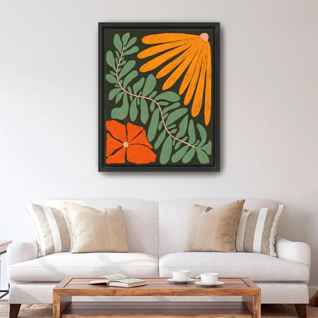 Introduce a breath of fresh air to your decor with this stunning abstract botanical canvas art print. Featuring an imaginative representation of botanical elements, this artwork harmoniously blends colors and shapes to create a captivating focal point.Available in black frame, dark walnut frame and oak frames, or as a frameless canvas. Our Gallery Wrap Canvas Prints are proudly assembled with high quality materials in California, USA. Each piece is printed on a thick, archival grade canvas using Giclee technology. It is then hand-stretched by our experienced artisans over solid pine bars, which will not warp over time. The final product is a piece personally crafted for you to confidently display on your wall. Care and Assembly: Ensure that the location of your piece has little to no exposure to heat, sunlight, and moisture. Wipe clean, only if needed. Each piece includes a sawtooth hanger to hang on your wall vertically.