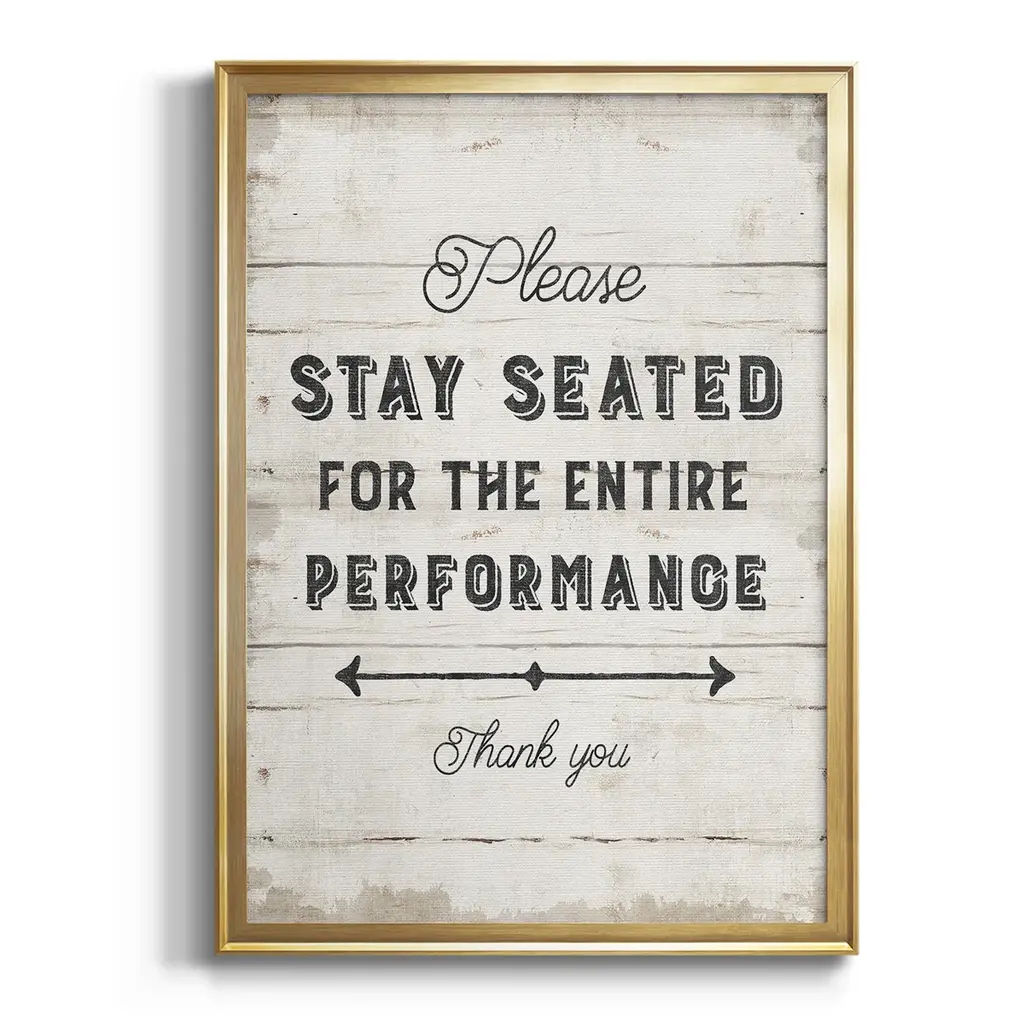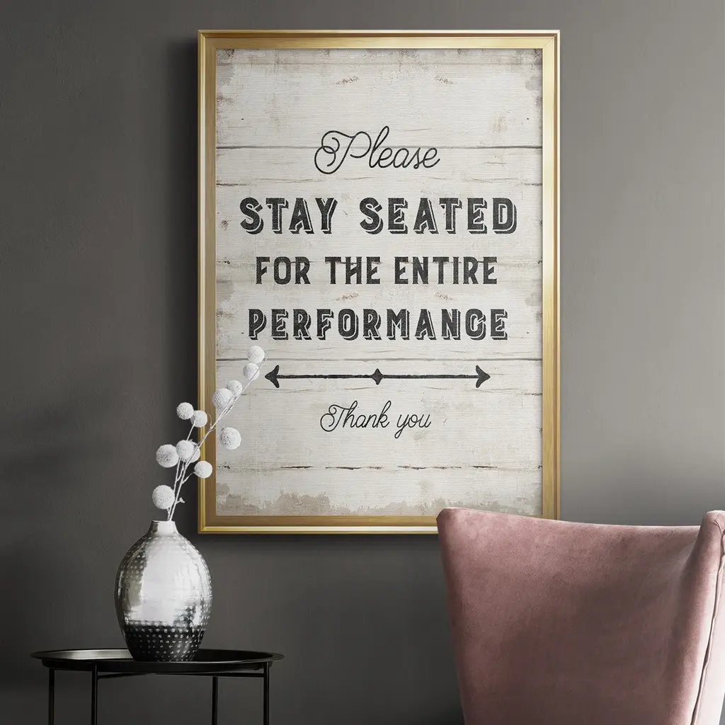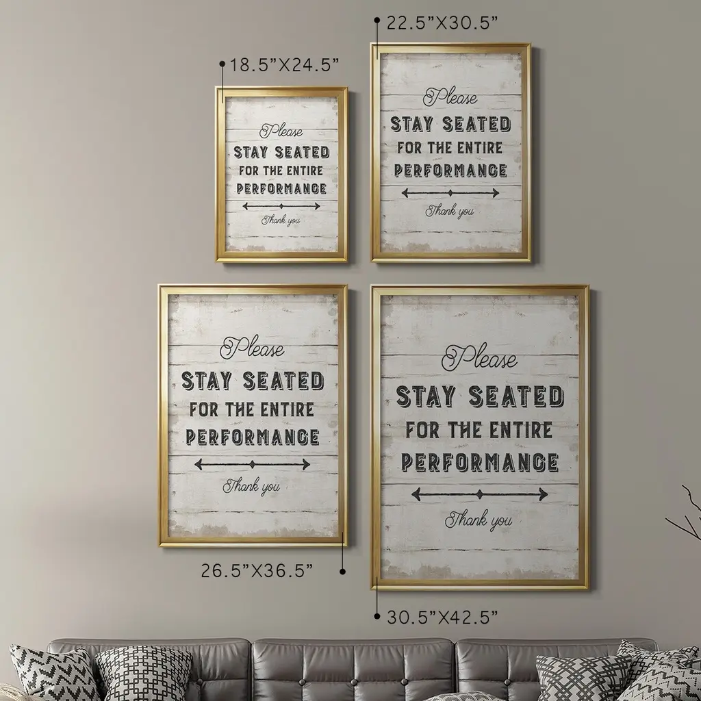 Please Stay Seated Premium Framed Print - Ready to Hang A Premium Framed Print created to last. Framed in distressed wood and available in an array of sizes and colors Featuring a beveled a solid wood stretcher bar, each piece comes ready to hand 4 SIZES AVAILABLE 30.5''X42.5'' - Overall Size 26.5'X36.5'' - Overall Size 22.5''x30.5'' - Overall Size 18.5''x24.5'' - Overall Size Each piece is made to order. Each piece comes with hanging hardware. Made in the USA Ready to Hang