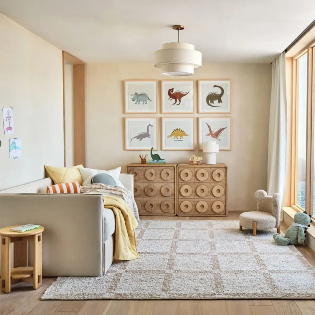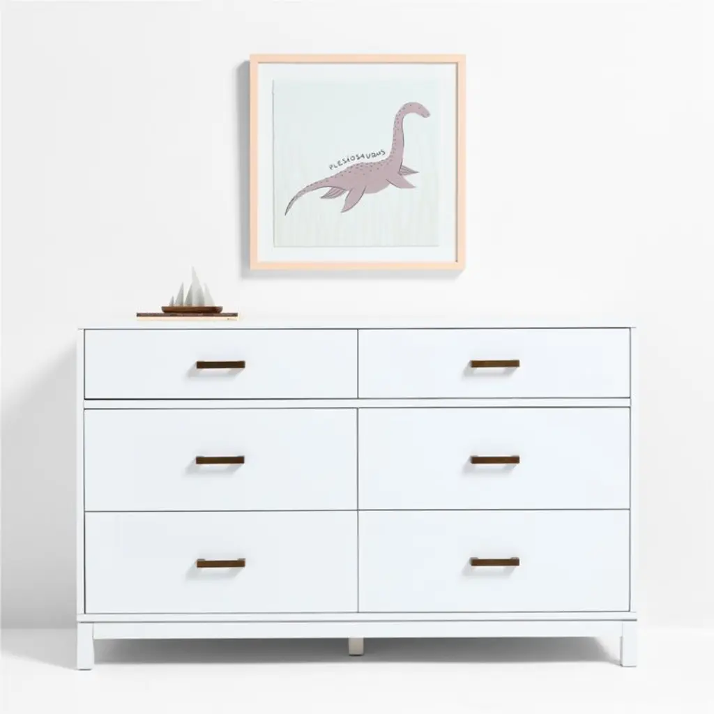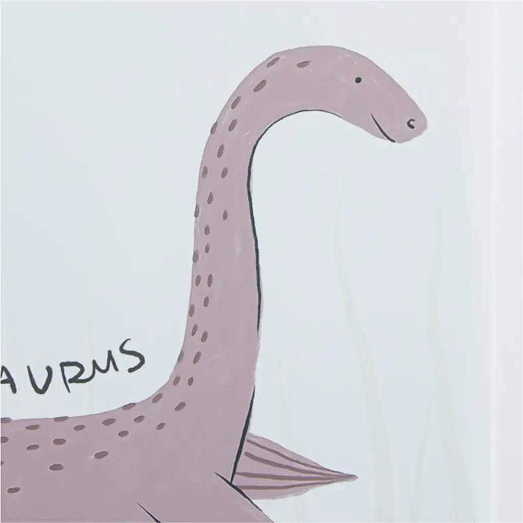 Our Plesiosaurus Wall Art Print roars with personality, thanks to the charming illustration and lettering style. A simple white matte and natural wood frame lend a clean, modern look while showing off the giclee print's vibrant colors. Alone or in a grid with other prints from our dinosaur series, it's the perfect wall art for any child who's reached their Jurassic age.