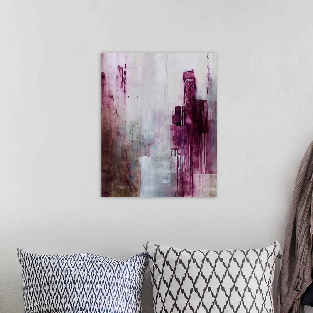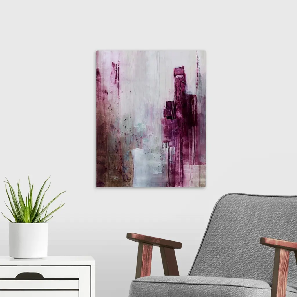 Contemporary abstract painting of plum tones smeared in a downward motion against a faded background.
