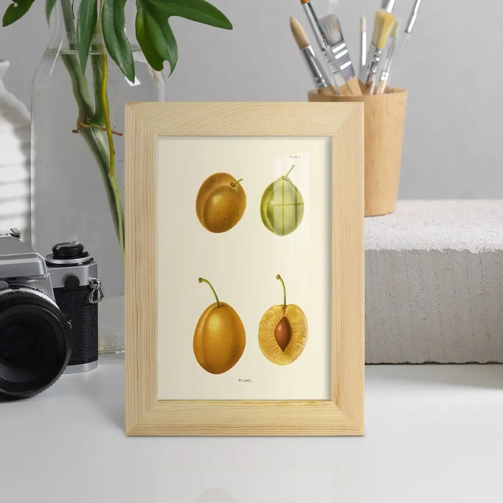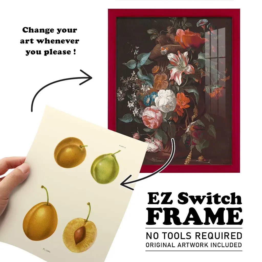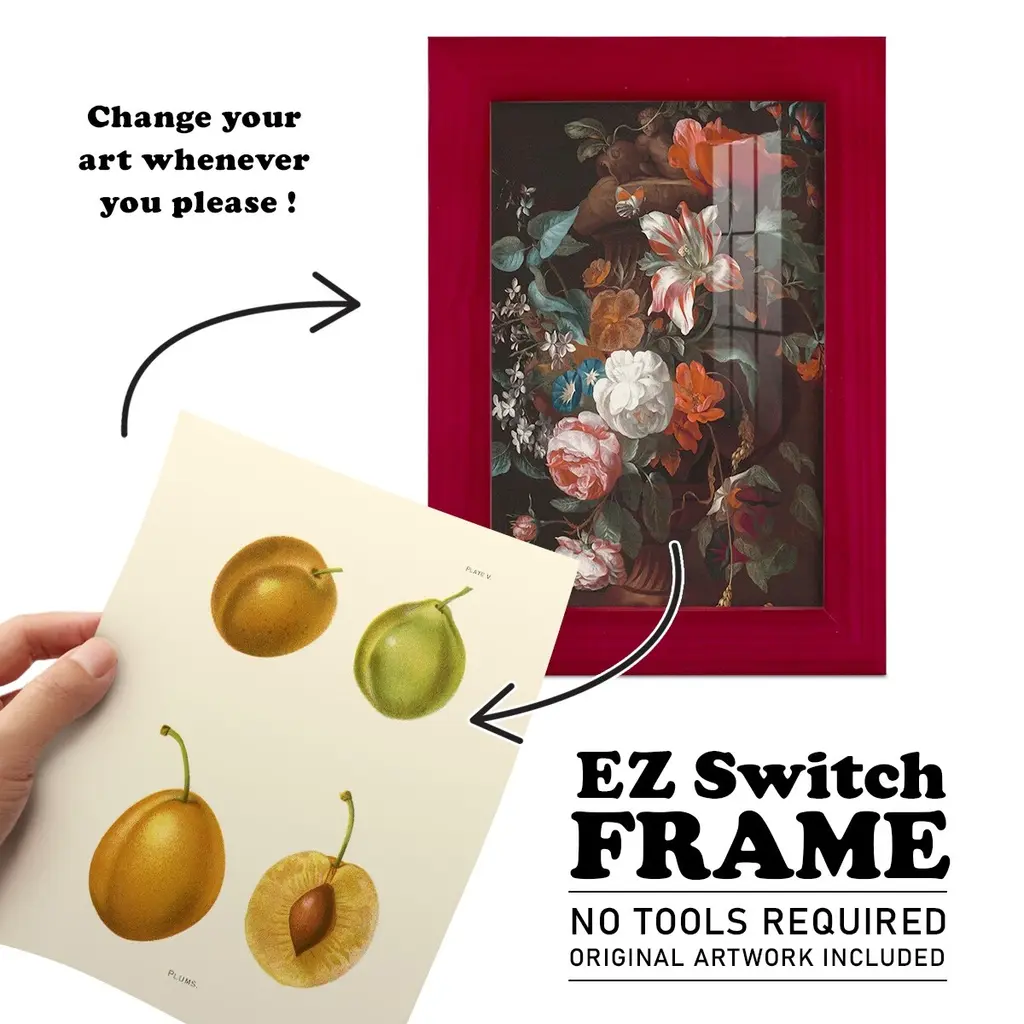 Plums I -EZ SWITCH Framed Print w/glass-Cherry Red A delightful, framed print. Featuring a solid wood frame with real wood glass. This premium print is giclee quality. In addition, every frame features a removable back and table top stand. This allows you to change your art in the future or to just stand the art on a table for a new look. We are sure you'll enjoy our new series of EZ SWITCH Framed Art. Solid Wood Frame Real Glass Removable / Replaceable Art Built in Tabletop Stand Sizes range from 4x6 up to 12x15 - buy just one or pair them up as sets as you see fit.