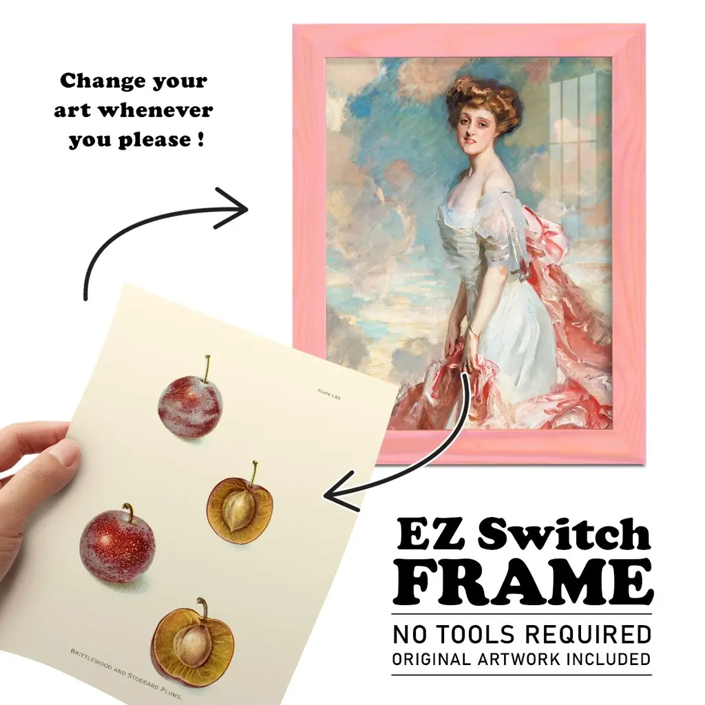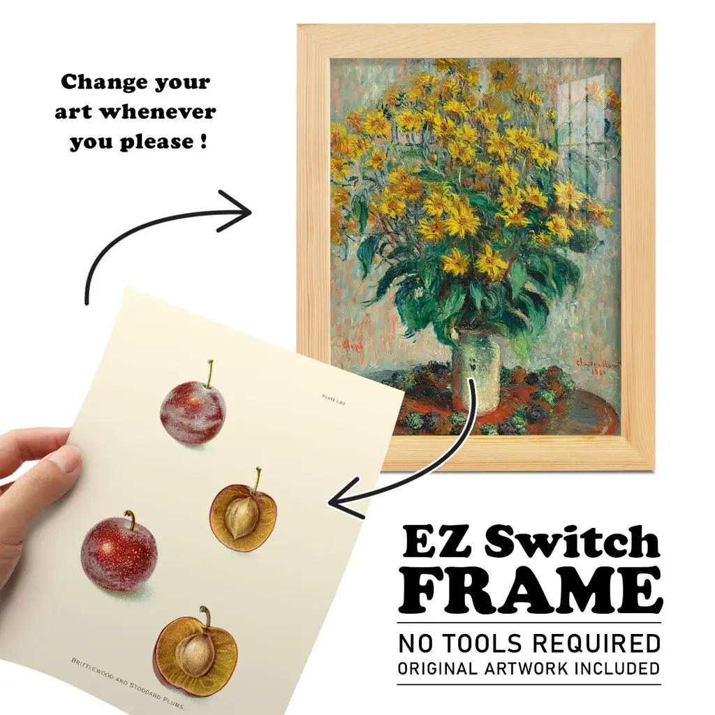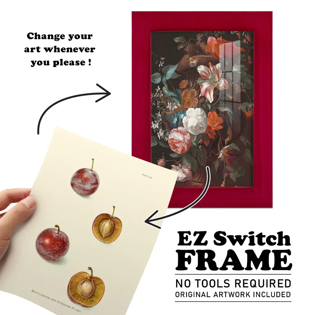Plums II -EZ SWITCH Framed Print w/glass-Cherry Red A delightful, framed print. Featuring a solid wood frame with real wood glass. This premium print is giclee quality. In addition, every frame features a removable back and table top stand. This allows you to change your art in the future or to just stand the art on a table for a new look. We are sure you'll enjoy our new series of EZ SWITCH Framed Art. Solid Wood Frame Real Glass Removable / Replaceable Art Built in Tabletop Stand Sizes range from 4x6 up to 12x15 - buy just one or pair them up as sets as you see fit.