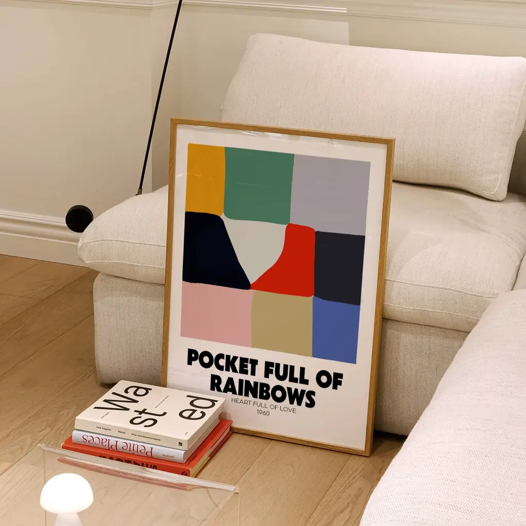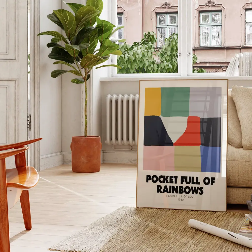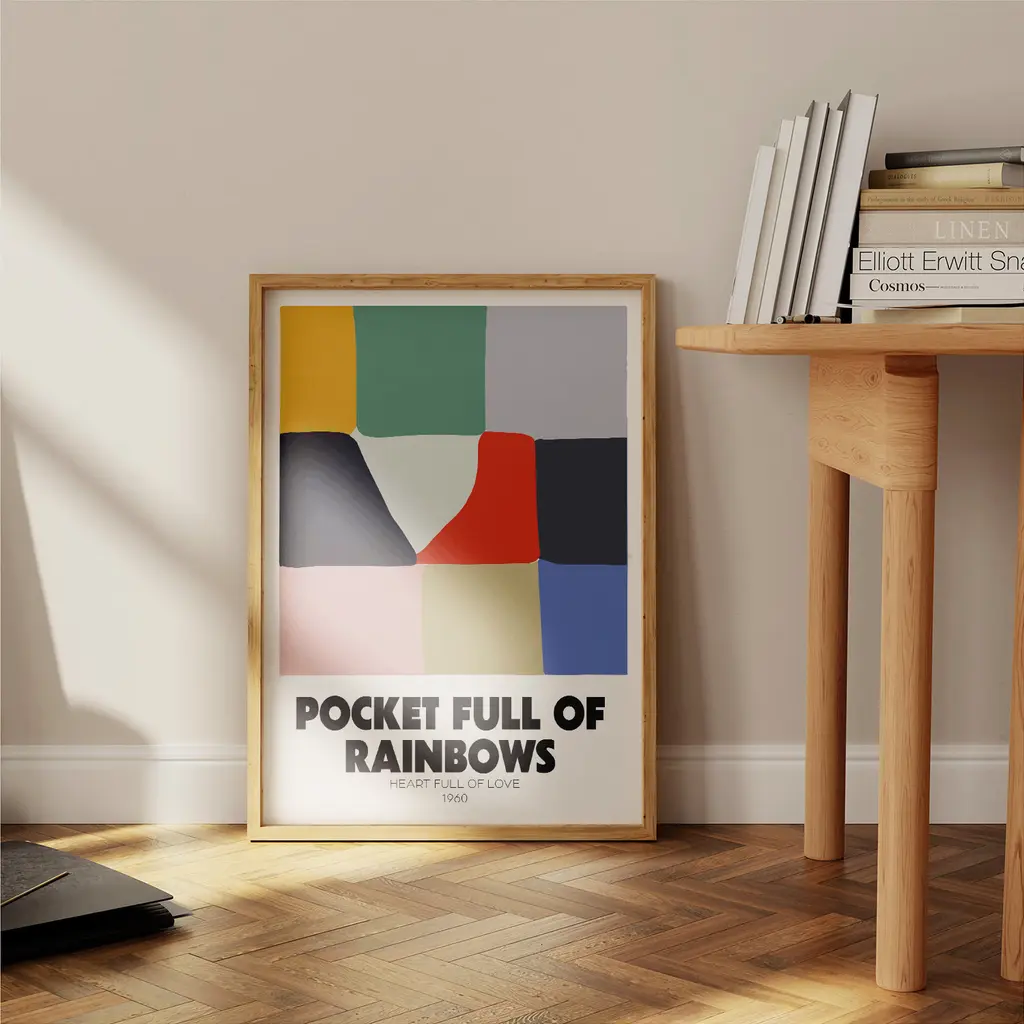 Pocket Full Of Rainbows Retro Art Print.Inspired by the legendary rock n roll king, Elvis Presley. Influenced by a playful and retro colour palette, taking influence from 1960s museum posters. Add some nostalgic and happy art into your homes.Sold without frameGiclée printed on Munken pure smooth cream paper which is certified by the Rainforest Alliance Program for FSC® Standards.