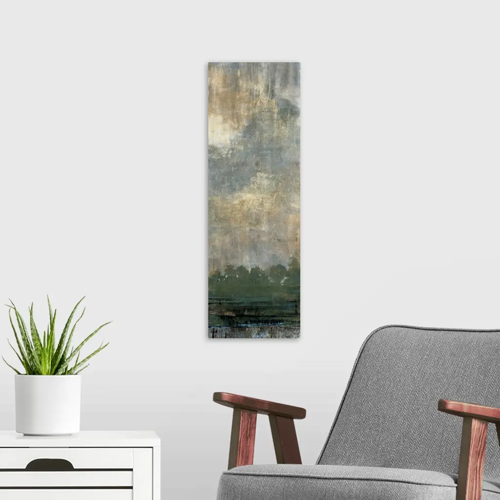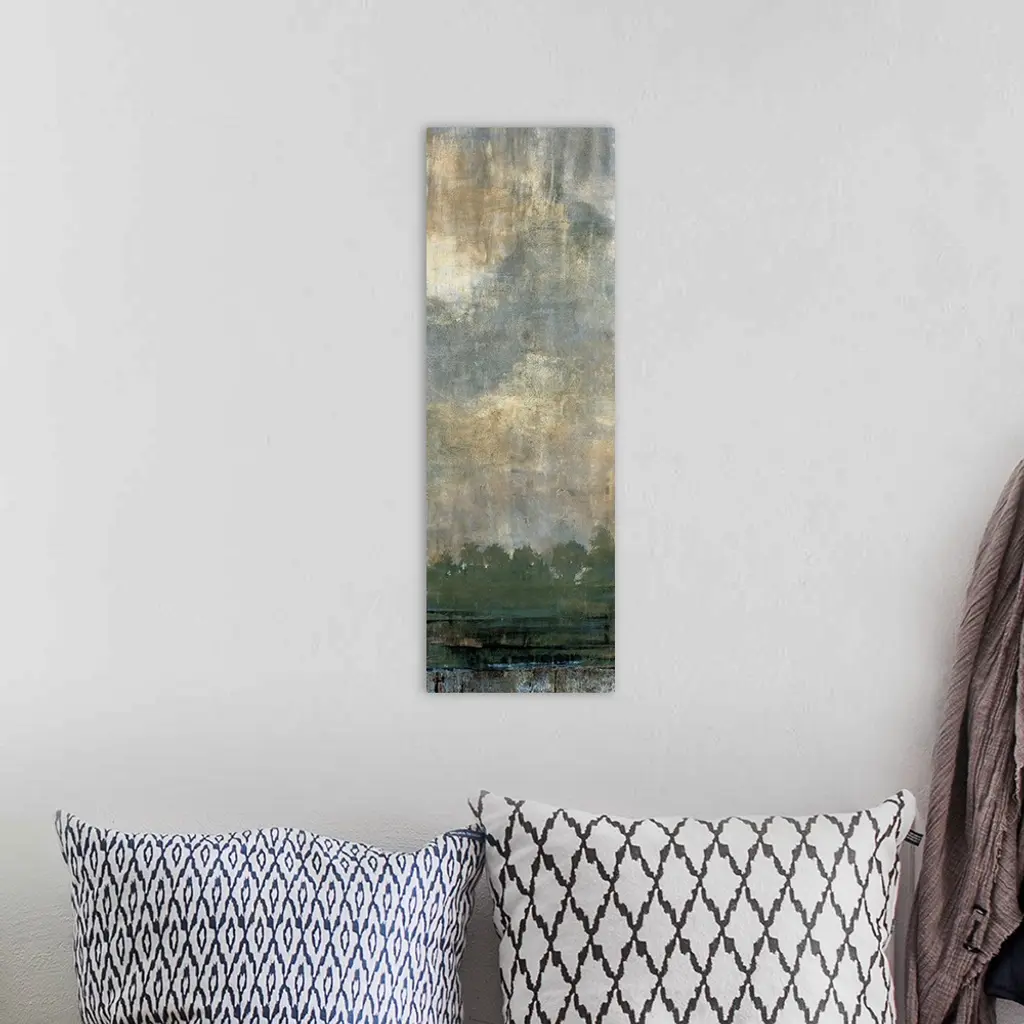 Contemporary painting of a line of trees with green foliage under a cloud filled sky.