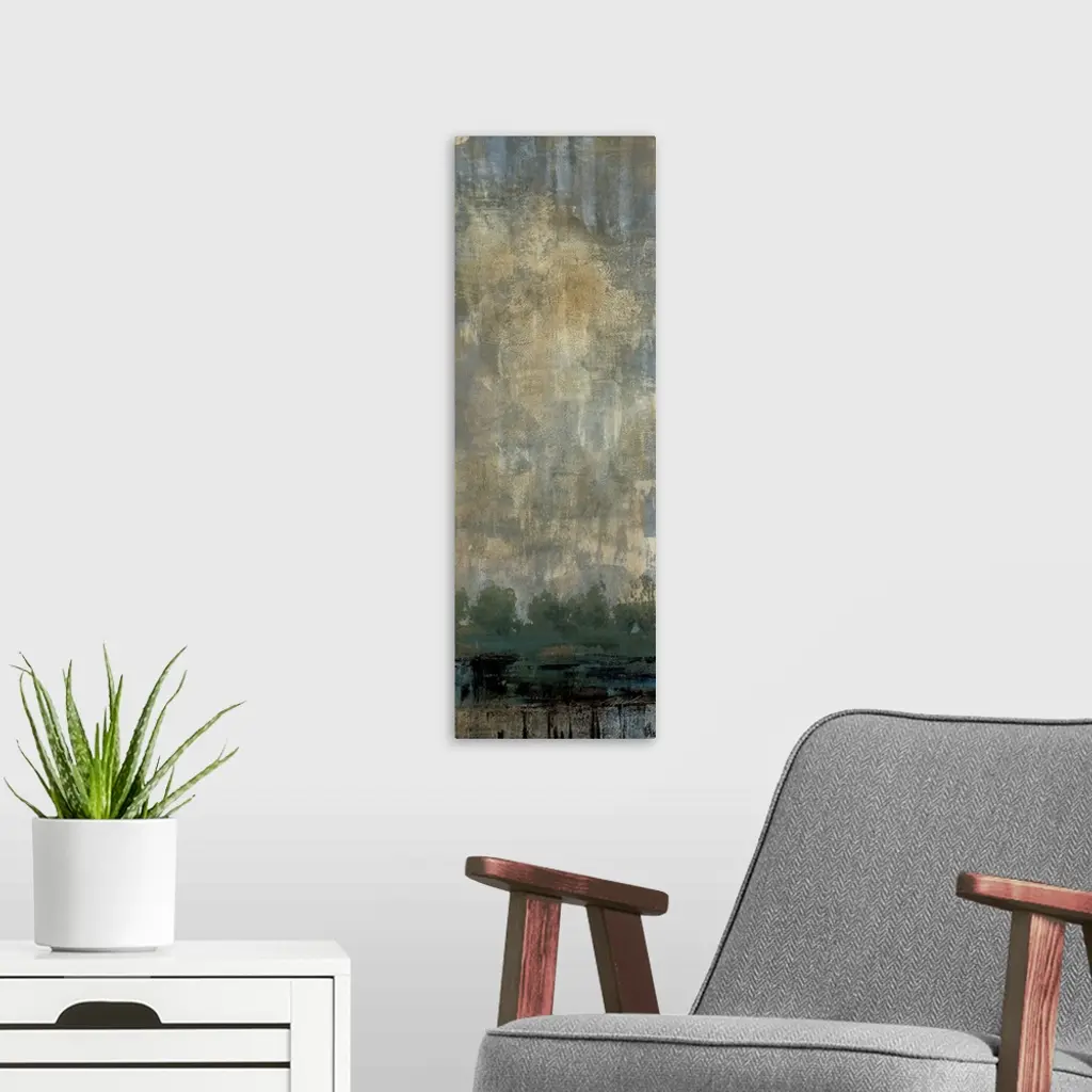 Contemporary painting of a line of trees with green foliage under a cloud filled sky.
