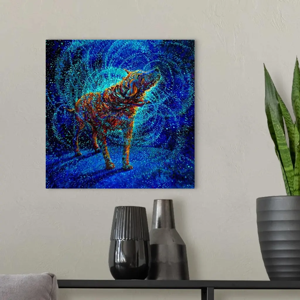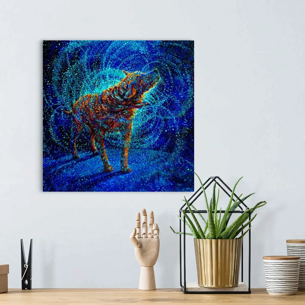 Brightly colored contemporary artwork of a dog shaking off water in circles.