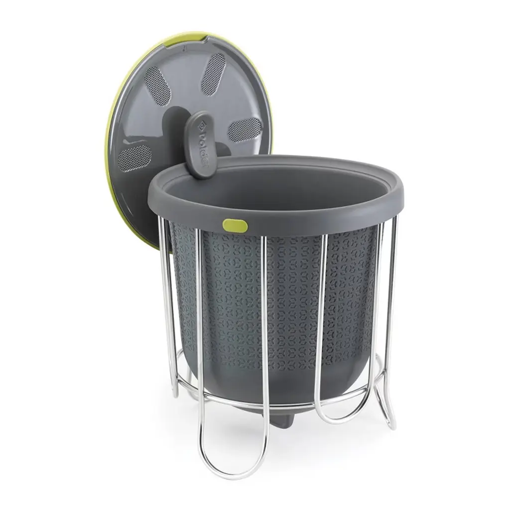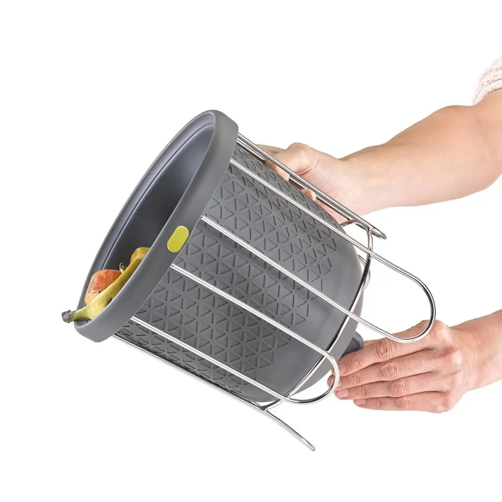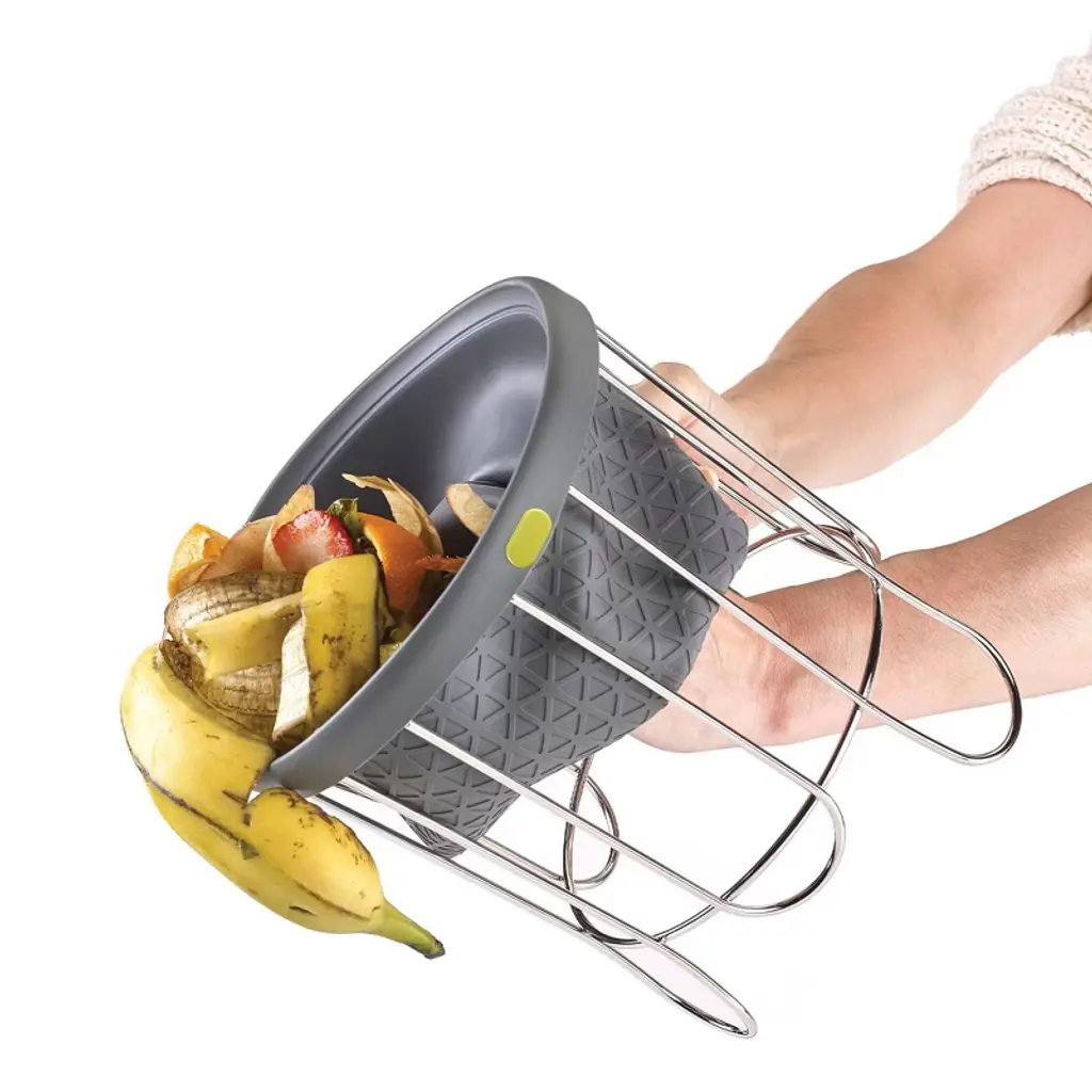 The Polder Kitchen Composter is a stylish and practical solution for managing kitchen waste while adding elegance to your countertop. Designed with a lightweight, portable frame, it makes transporting compost to your outdoor bin easy. The flexible push-through silicone bucket inverts to empty contents, and the non-stick surface rinses clean with ease. Featuring an adjustable aerobic compost setting, the lid rotates to control airflow, helping manage odor and optimize decomposition. With a generous 1-gallon (3.8-liter) capacity, this composter is perfect for daily use. The easy-to-remove silicone bucket is dishwasher safe (top rack only), and the bin clip attachments hold the bucket securely when inverting. Made with a thick steel frame, the Polder Kitchen Composter is both functional and an elegant addition to any kitchen décor.