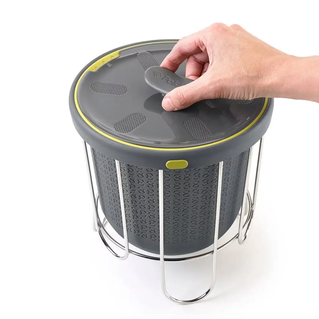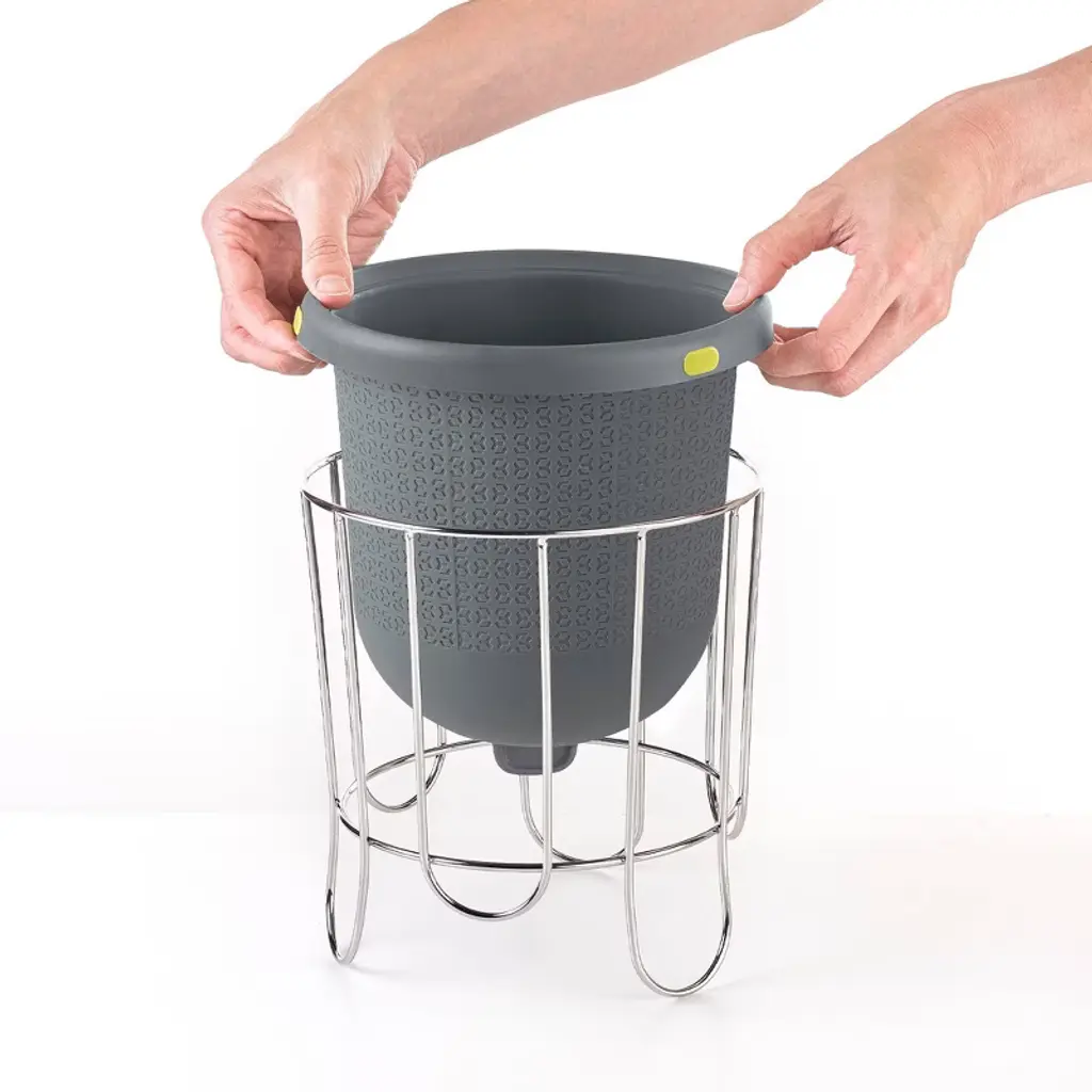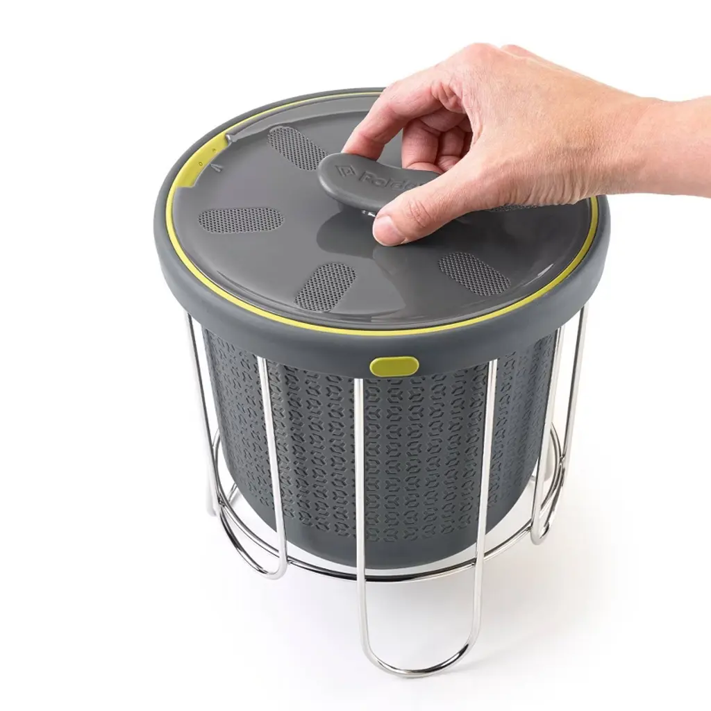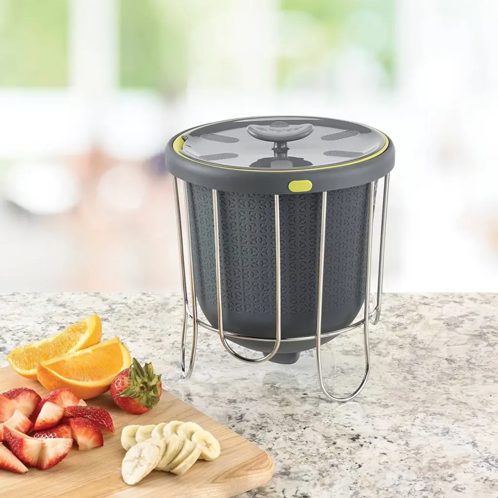 The Polder Kitchen Composter is a stylish and practical solution for managing kitchen waste while adding elegance to your countertop. Designed with a lightweight, portable frame, it makes transporting compost to your outdoor bin easy. The flexible push-through silicone bucket inverts to empty contents, and the non-stick surface rinses clean with ease. Featuring an adjustable aerobic compost setting, the lid rotates to control airflow, helping manage odor and optimize decomposition. With a generous 1-gallon (3.8-liter) capacity, this composter is perfect for daily use. The easy-to-remove silicone bucket is dishwasher safe (top rack only), and the bin clip attachments hold the bucket securely when inverting. Made with a thick steel frame, the Polder Kitchen Composter is both functional and an elegant addition to any kitchen décor.
