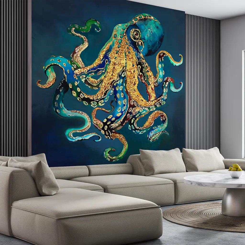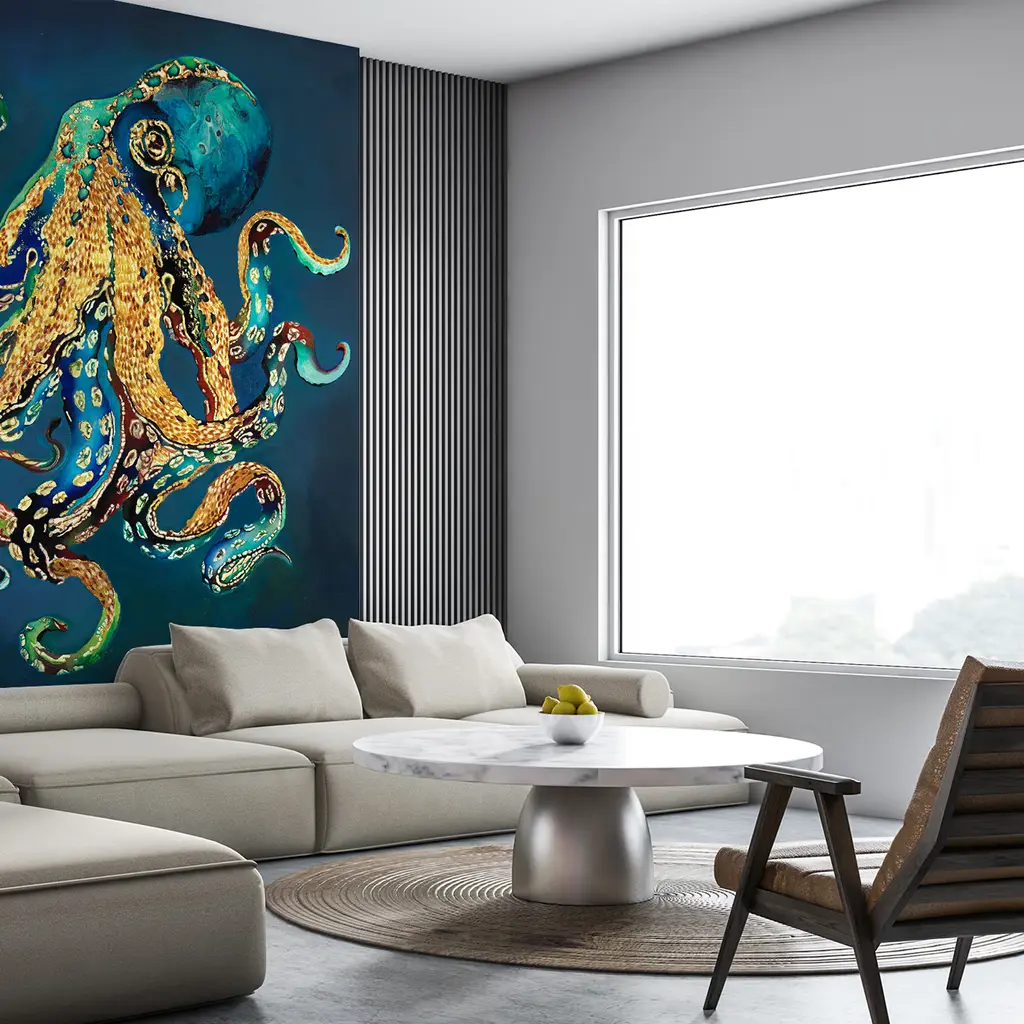 Showcasing a mesmerizing choice of colors that will infuse a vivacious and captivating ambiance in a modern interior, this striking work depicts a fantastic octopus in blue, emerald green, red and gold shades. Masterfully created with innovative techniques, it is composed of two Kerlite® slabs (100 x 250cm) finished by hand with acrylic colors in a metallic effect enhanced with gold leaf for a more powerful visual impact, and completed with clear and crystalline epoxy resins. Also available in fiberglass or ECO variants upon request to the Concierge.