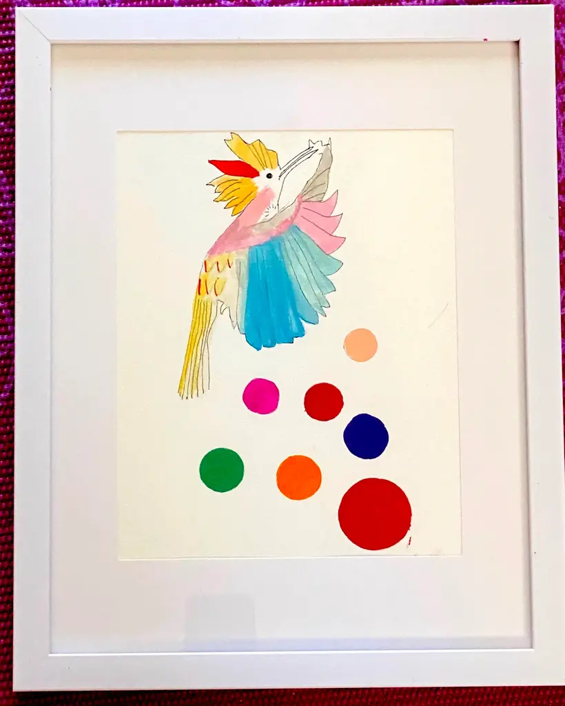 "Polka Dots With Hummingbird" Contemporary Modern Abstract Print, Framed