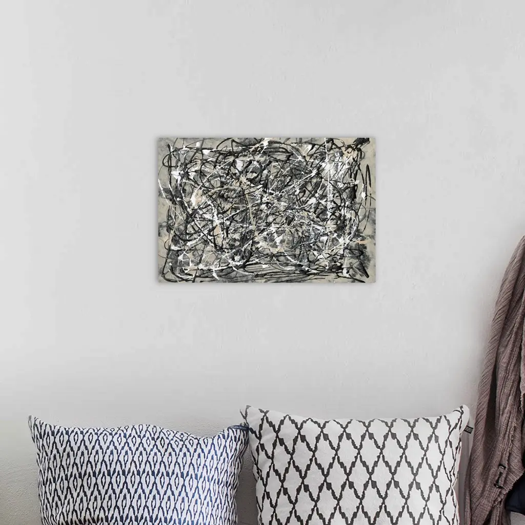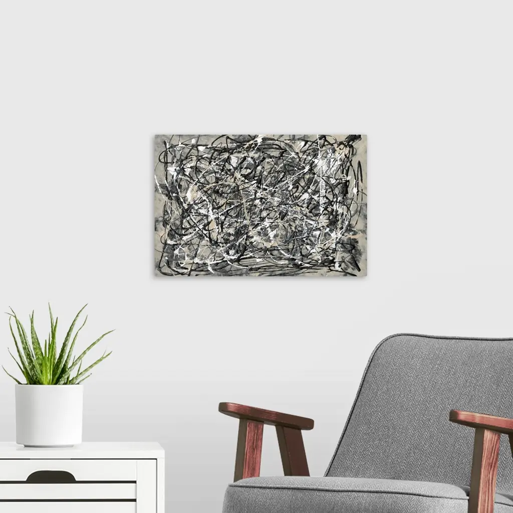 A striking, masculine contemporary abstract painting featuring bold swirls of black and white paint on a beige background, in the style of Jackson Pollack