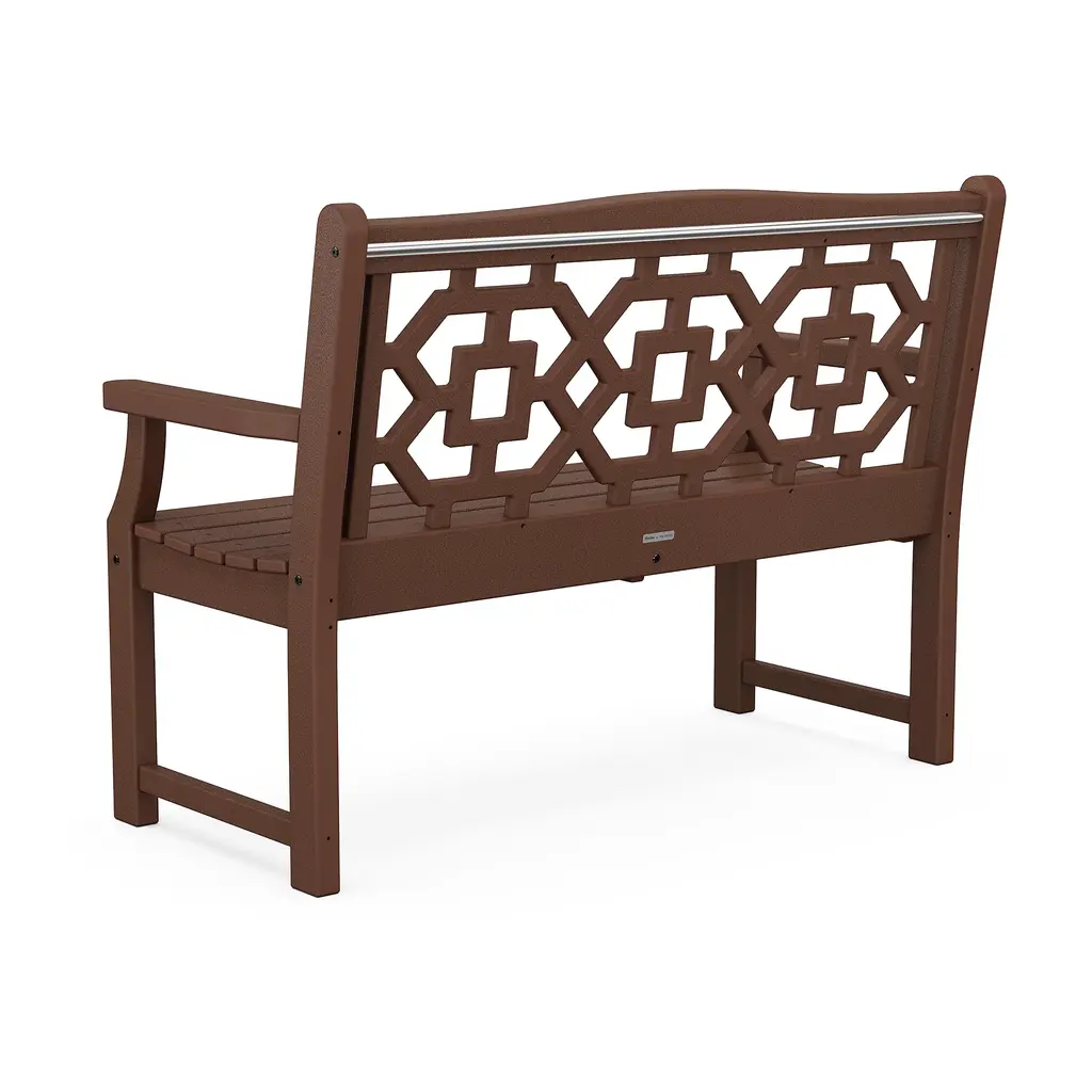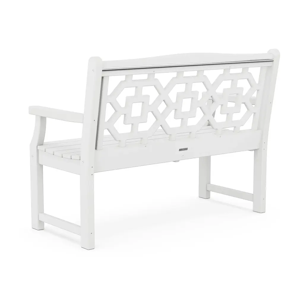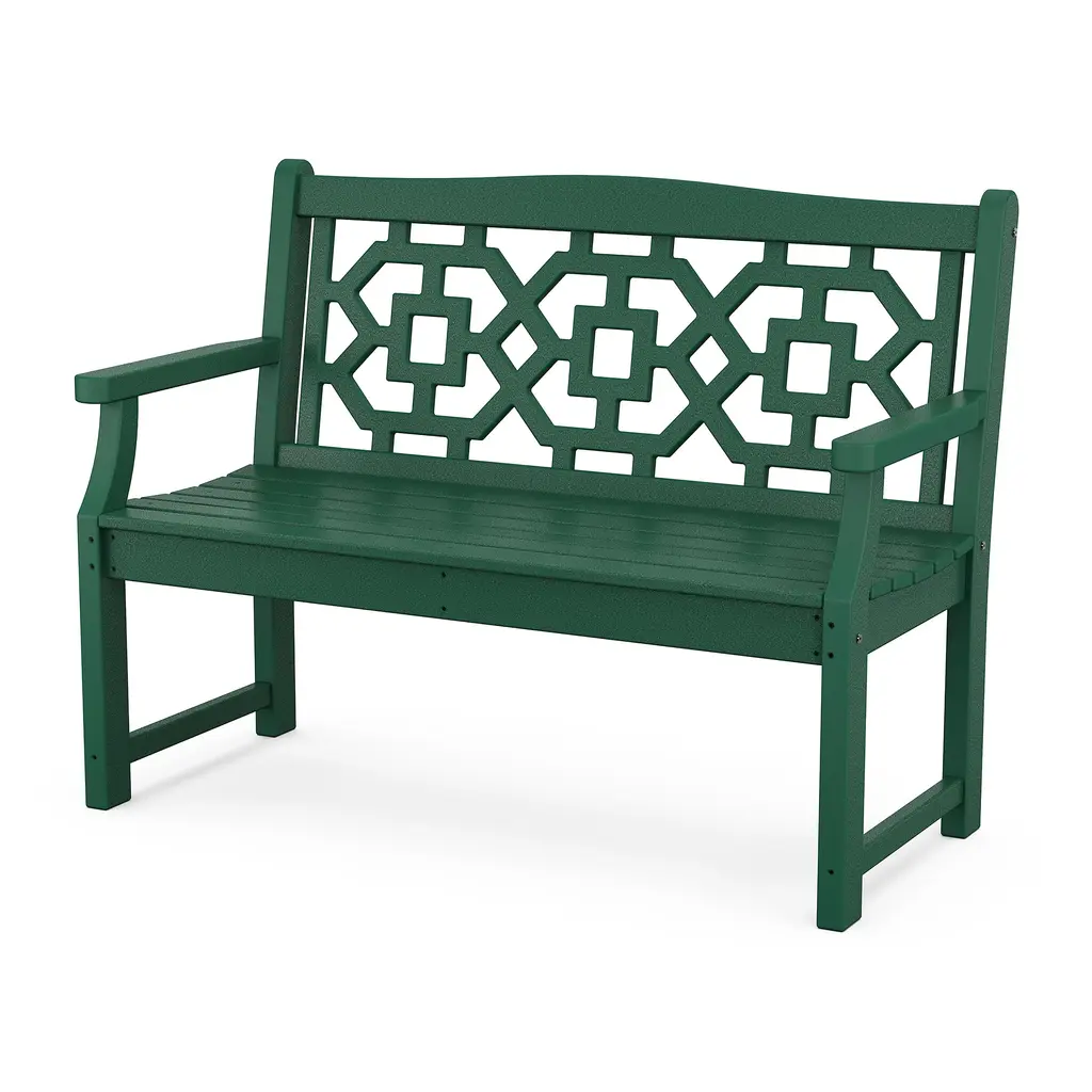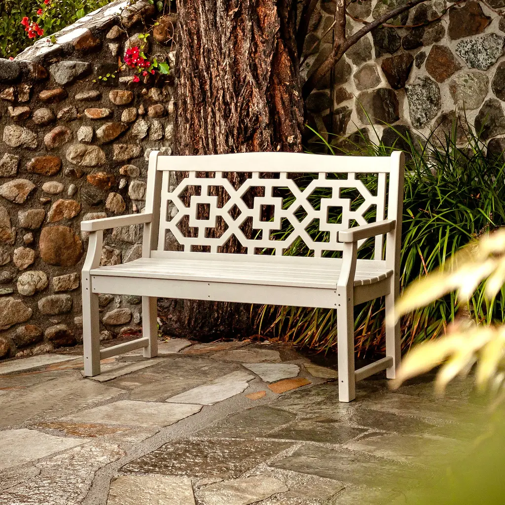 Our USA-made POLYWOOD® Furniture is the epitome of timeless outdoor elegance fused with unparalleled durability. The Chinoiserie Garden Bench features comfortably contoured seat, graceful lines and intricate latticework; brings a peaceful presence wherever you place it. Crafted from recycled materials that were otherwise bound for the landfill, POLYWOOD mimics the weight, texture and grain of wood but without the hassle or maintenance. Say goodbye to painting, cracking, rotting, peeling or warping! Its "color-stay" technology features UV inhibitors and stabilizers that protect from environmental degradation so it can endure the harshest elements, including scorching sun, snowy winters and coastal winds. Genuine POLYWOOD furniture is infinitely recyclable and sustainable made. Includes marine-grade stainless steel hardware that will not rust. Available in a spectrum of colors to fit a variety of tastes, styles and decor. POLYWOOD is built to last a lifetime and designed for life outdoors. Perfect for deck, patio, porch, poolside, beach house, cabin and more. Any climate, any season, it's forever furniture. Consciously crafted in the USA. Some assembly required.