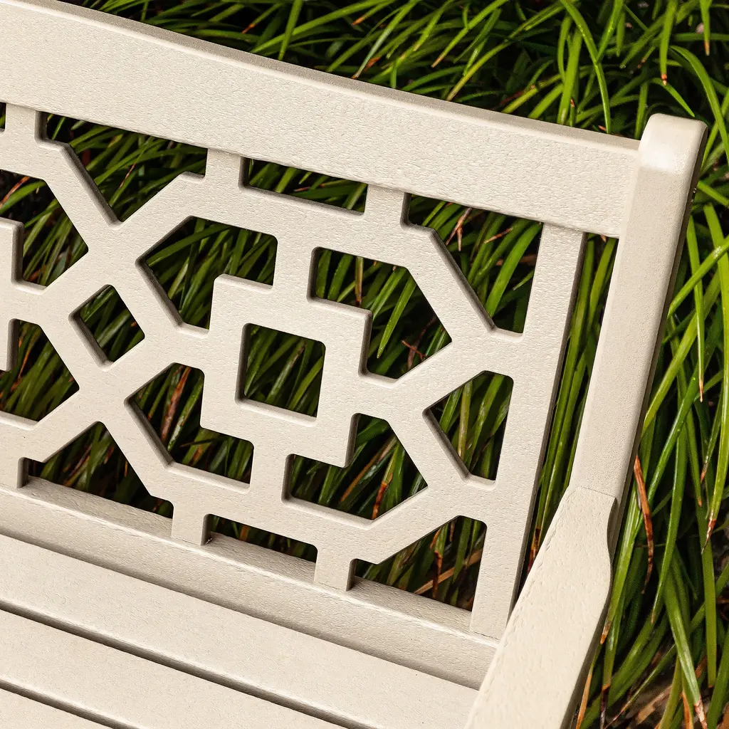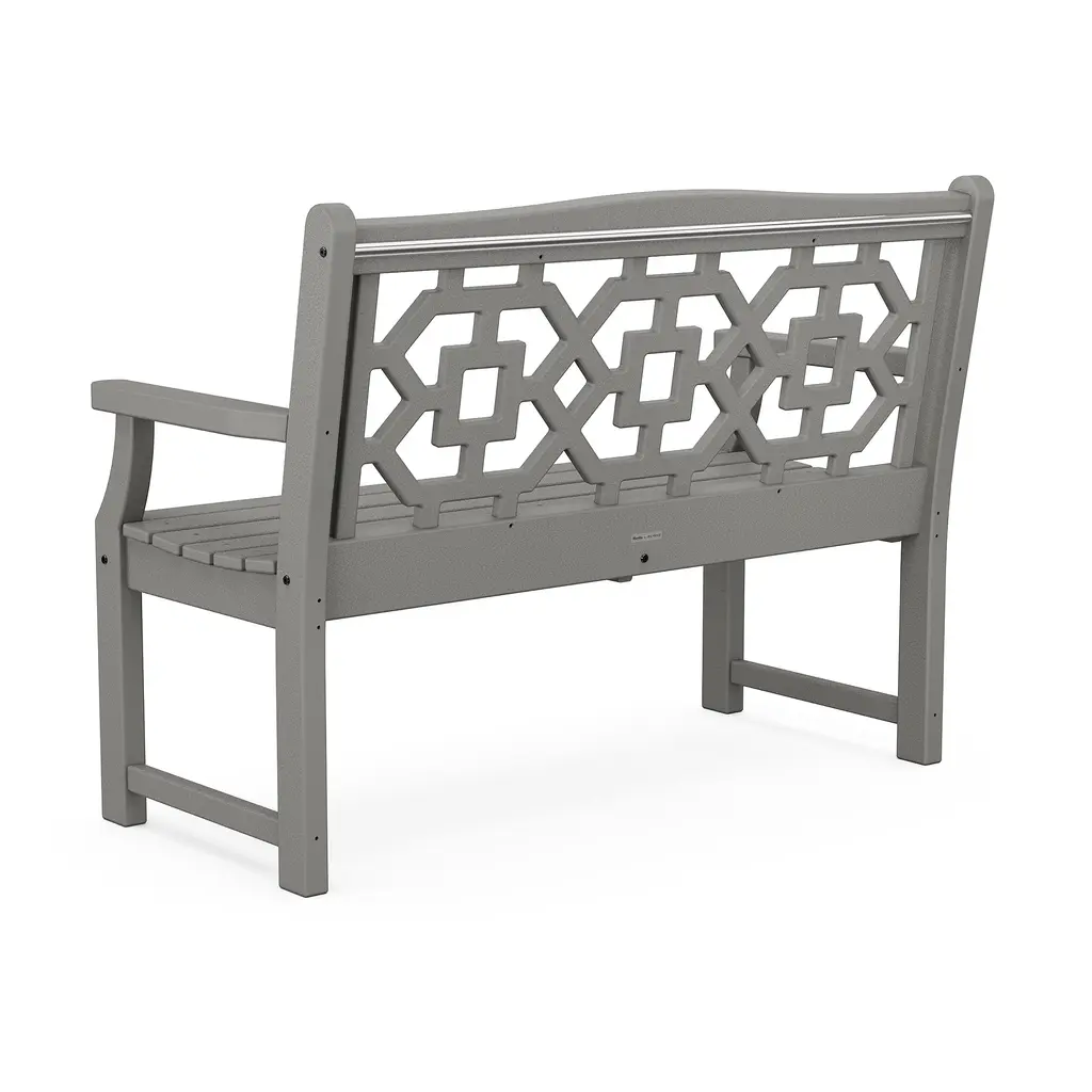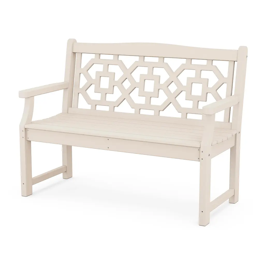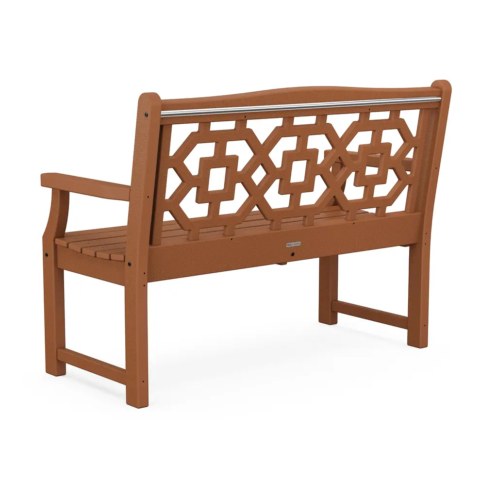 Our USA-made POLYWOOD® Furniture is the epitome of timeless outdoor elegance fused with unparalleled durability. The Chinoiserie Garden Bench features comfortably contoured seat, graceful lines and intricate latticework; brings a peaceful presence wherever you place it. Crafted from recycled materials that were otherwise bound for the landfill, POLYWOOD mimics the weight, texture and grain of wood but without the hassle or maintenance. Say goodbye to painting, cracking, rotting, peeling or warping! Its "color-stay" technology features UV inhibitors and stabilizers that protect from environmental degradation so it can endure the harshest elements, including scorching sun, snowy winters and coastal winds. Genuine POLYWOOD furniture is infinitely recyclable and sustainable made. Includes marine-grade stainless steel hardware that will not rust. Available in a spectrum of colors to fit a variety of tastes, styles and decor. POLYWOOD is built to last a lifetime and designed for life outdoors. Perfect for deck, patio, porch, poolside, beach house, cabin and more. Any climate, any season, it's forever furniture. Consciously crafted in the USA. Some assembly required.