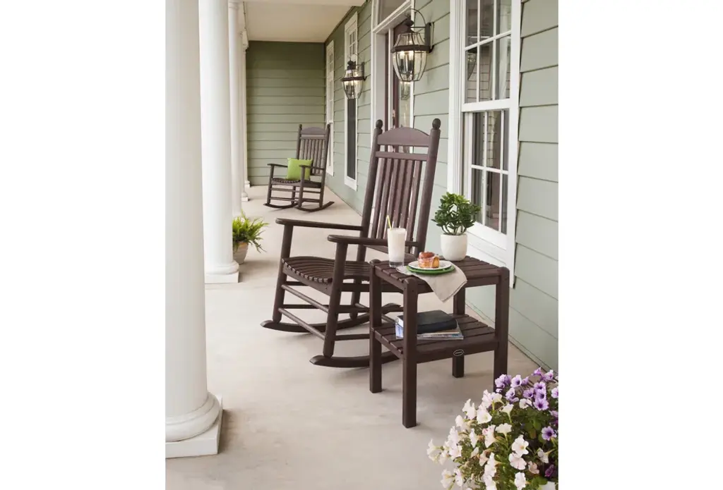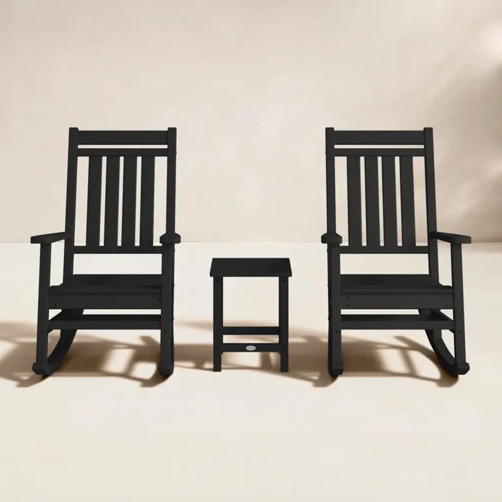 Imagine whiling away the hours, or at least taking a few minutes to watch the sun set, amid the timeless tradition and classic style of the POLYWOOD Jefferson 3-Piece Rocker Set. This heirloom-quality set includes two Jefferson Rockers that are designed for ultimate comfort with contoured seats, wide arms and back slats that provide both comfort and support. In addition, the set comes with a charming Two Shelf Side Tablea perfect accent to your seating area. Constructed of solid POLYWOOD recycled lumber in your choice of four fade-resistant colors, this set is built to last with very little maintenance.Set includes two J147 Jefferson Rockers and one TWST Two Shelf Side TableAvailable in a variety of attractive, fade-resistant colorsConstructed of genuine POLYWOOD lumber, a proprietary blend of plastics which includes recycled milk jugs and detergent bottlesPOLYWOOD lumber requires no painting, staining, waterproofing, or similar maintenancePOLYWOOD lumber does not splinter, crack, chip, peel or rot and it is resistant to corrosive substances such as oil, salt spray and other environmental stressesSolid, heavy-duty construction withstands nature's elementsPOLYWOOD lumber resists stains associated with wine and condiments and cleans easily with soap and waterMarine-grade quality hardware20-year residential warranty; 3-year commercial warrantyMade in the USA
